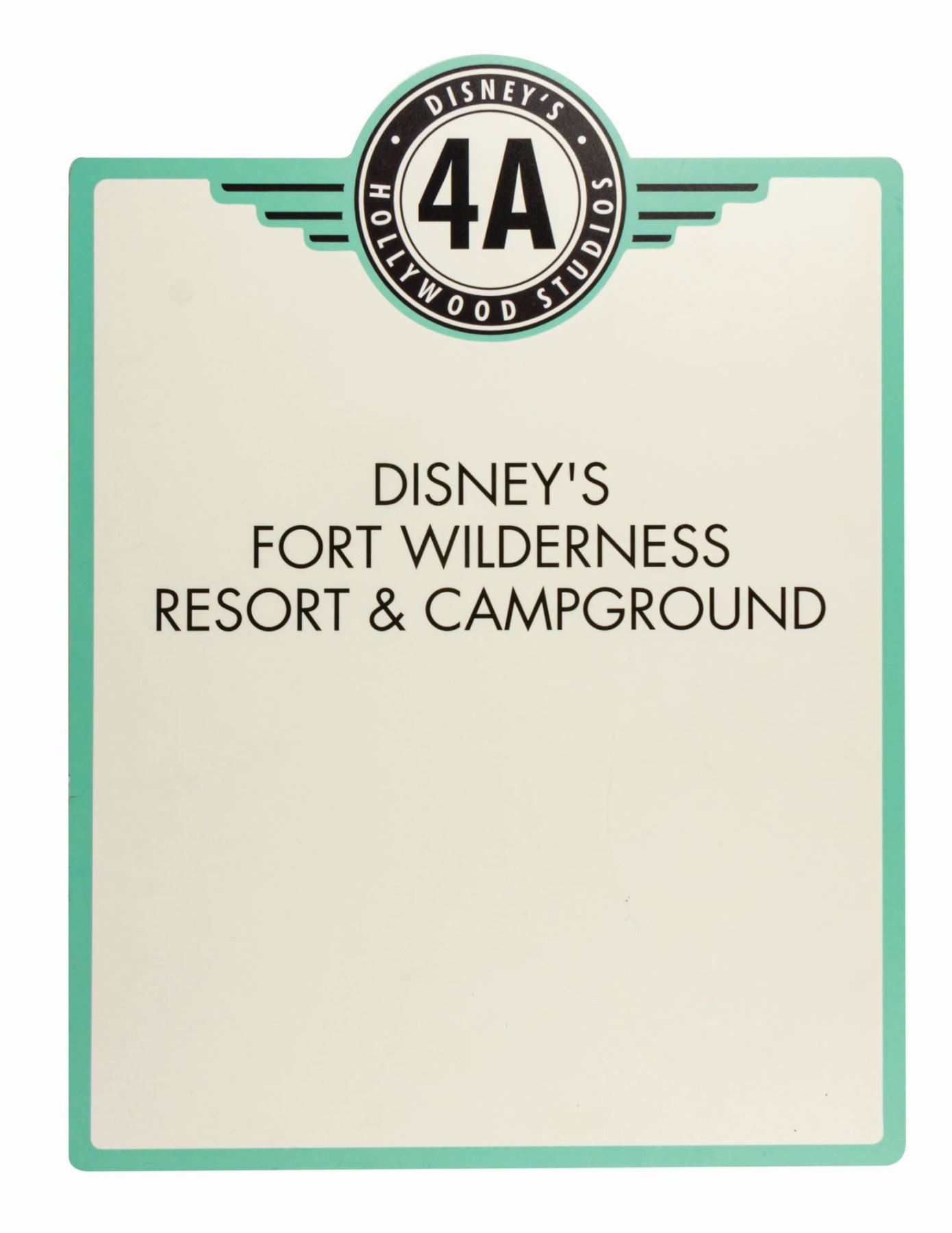 (Fort Wilderness, c.2010s) An original bus stop sign from Disney's Hollywood Studios directing guests to the Fort Wilderness Resort & Campground. Printed on sturdy foam board, the sign measures 24"x18" and is in very good condition with minor surface wear.