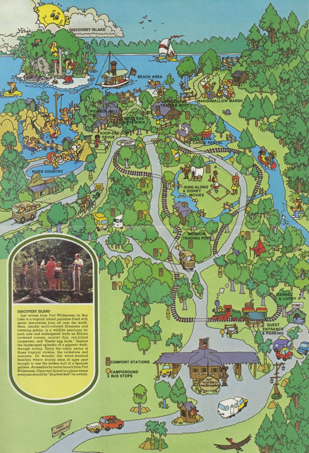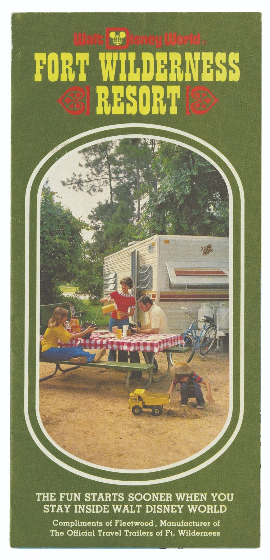 (Fort Wilderness, 1978) A rare fold-out brochure created for the Fort Wilderness Resort. The brochure contains information about camping accommodations, the River Country water park, and nightly entertainment at Pioneer Hall. When unfolded, the brochure measures 17.25"x11.75" and features a full-page color map of Discovery Island. The brochure is in good condition with some bending and expected edge-wear particularly along the fold-lines.