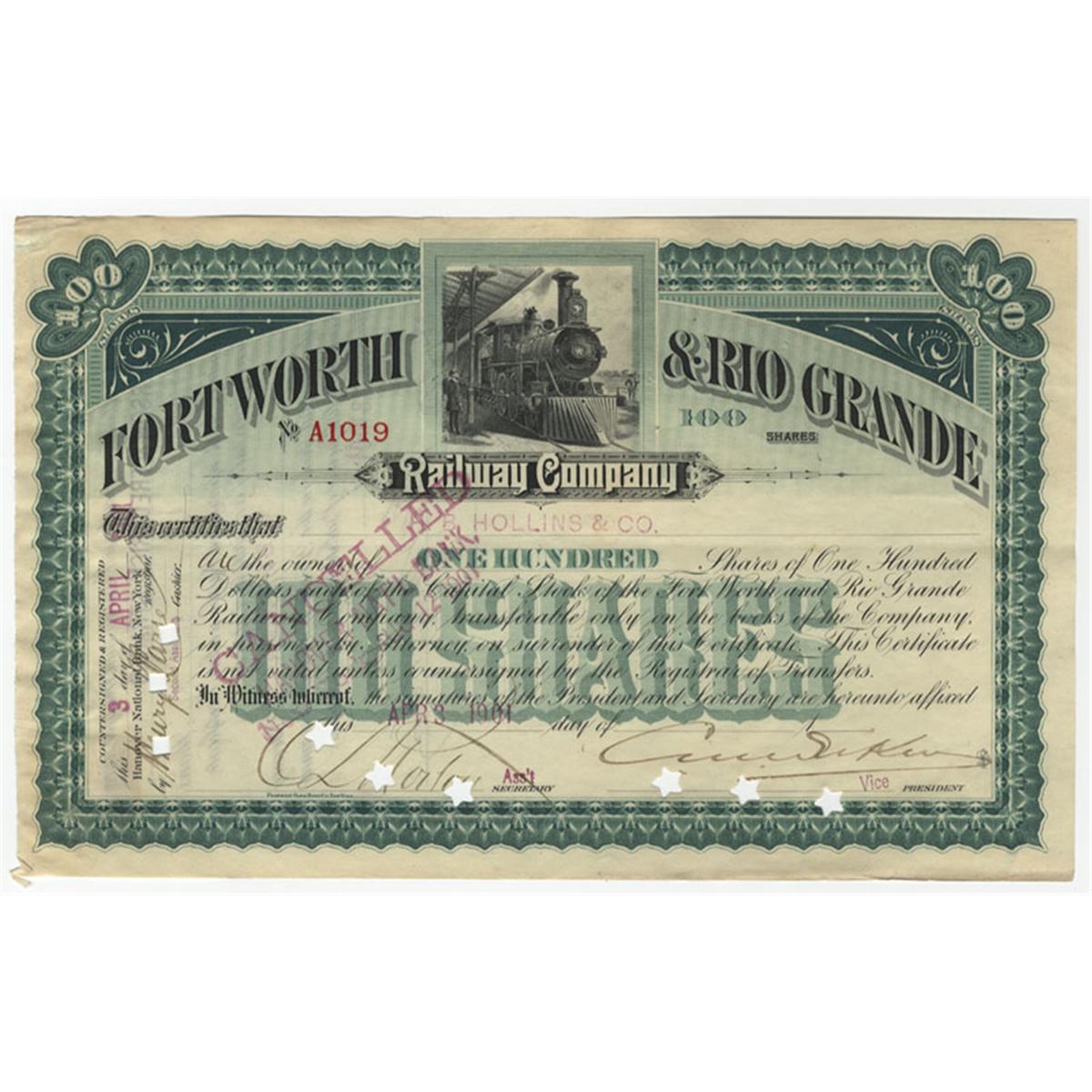 The Fort Worth & Rio Grande Railway was chartered in 1885 in order to construct a line between Fort Worth and Brownwood, TX. While it was hoped that the line would strengthen the local economy, the company ran in the red for many years before being purchased by the Atchison, Topeka and Santa Fe in 1937. 1901, Texas. Stock certificate for one hundred shares. Green / White. Vignette of a locomotive at a station at top center. Green underprint. Blind embossed company seal. Punch and stamp cancelled.