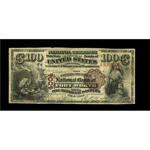 <B>Fort Worth, TX</B></I> - $100 1882 Brown Back Fr. 523 <B>The Farmers & Mechanics NB</B></I> Ch. # 4004<BR>The census shows twenty six $100 Brown Backs from the state of Texas, about ten percent of the total known from the entire country. Of that number, just two come from Fort Worth, both from this bank, and both in just about the same grade. This example is an evenly circulated pen signed specimen that displays the deep chocolate color that is sometimes found on Brown Backs, lending it great eye appeal far in excess of its technical grade. There are a few pinholes, but it is certainly safe to say that no serious collector of National Bank Notes would not eagerly embrace the opportunity to own this attractive item. Nice <B>Fine+.</B></I><BR><BR><b>Shipping:</b> Coin/Currency (<a target="_blank" href="http://www.heritageauctions.com/common/shipping.php">view shipping information</a>)