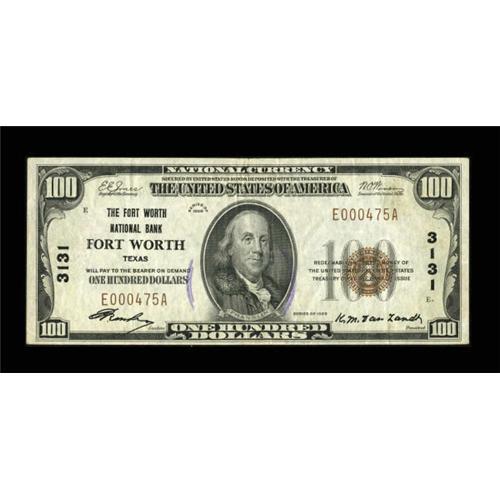 <B>Fort Worth, TX</B></I> - $100 1929 Ty. 1 <B>The Fort Worth NB</B></I> Ch. # 3131<BR> The paper is perfectly original and bright white with much of the embossing remaining. However, there is a partial teller stamp that we must mention for the sake of accuracy. <B>Very Fine.</B></I><BR><BR><b>Shipping:</b> Coins & Currency (<a target="_blank" href="http://www.heritageauctions.com/common/shipping.php">view shipping information</a>)