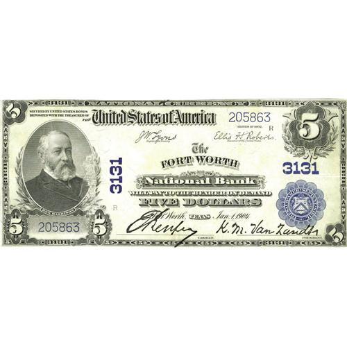 <B>Fort Worth, TX</B></I> - $5 1902 Plain Back Fr. 598 <B>The Fort Worth NB</B></I> Ch. # 3131<BR>Bright surfaces are seen on this issue from "Cow Town." The deep signatures draw more attention than the paper skin seen within the portrait area. <B>Very Fine.</B></I>