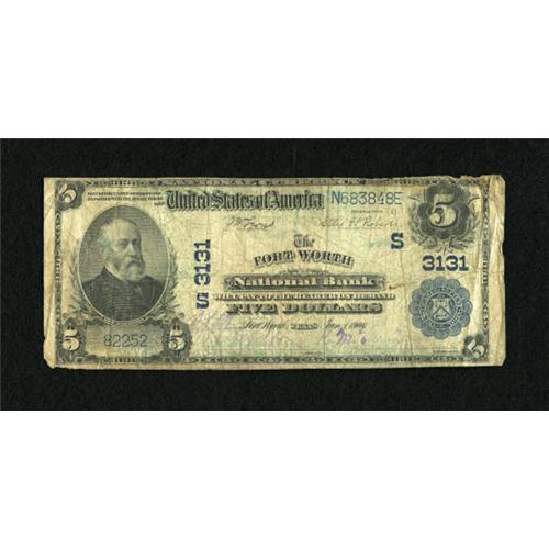 <B>Fort Worth, TX</B></I> - $5 1902 Plain Back Fr. 598 <B>The Fort Worth NB</B></I> Ch. # (S)3131<BR> A nice <B>Very Good </B></I>example from this ever popular bank.<BR><BR><b>Shipping:</b> Coins & Currency (<a target="_blank" href="http://www.heritageauctions.com/common/shipping.php">view shipping information</a>)