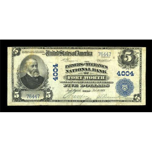 <B>Fort Worth, TX</B></I> - $5 1902 Plain Back Fr. 600 <B>The Farmers & Mechanics NB</B></I> Ch. # 4004<BR> This piece features the same signers as the other Farmers & Mechanics note in this auction, though it lacks the geographic sort letter, indicating it was printed sometime after March of 1924. The paper is original and solid and the stamped signatures remain strong. <B>Very Fine.</B></I><BR><BR><b>Shipping:</b> Coins & Currency (<a target="_blank" href="http://www.heritageauctions.com/common/shipping.php">view shipping information</a>)