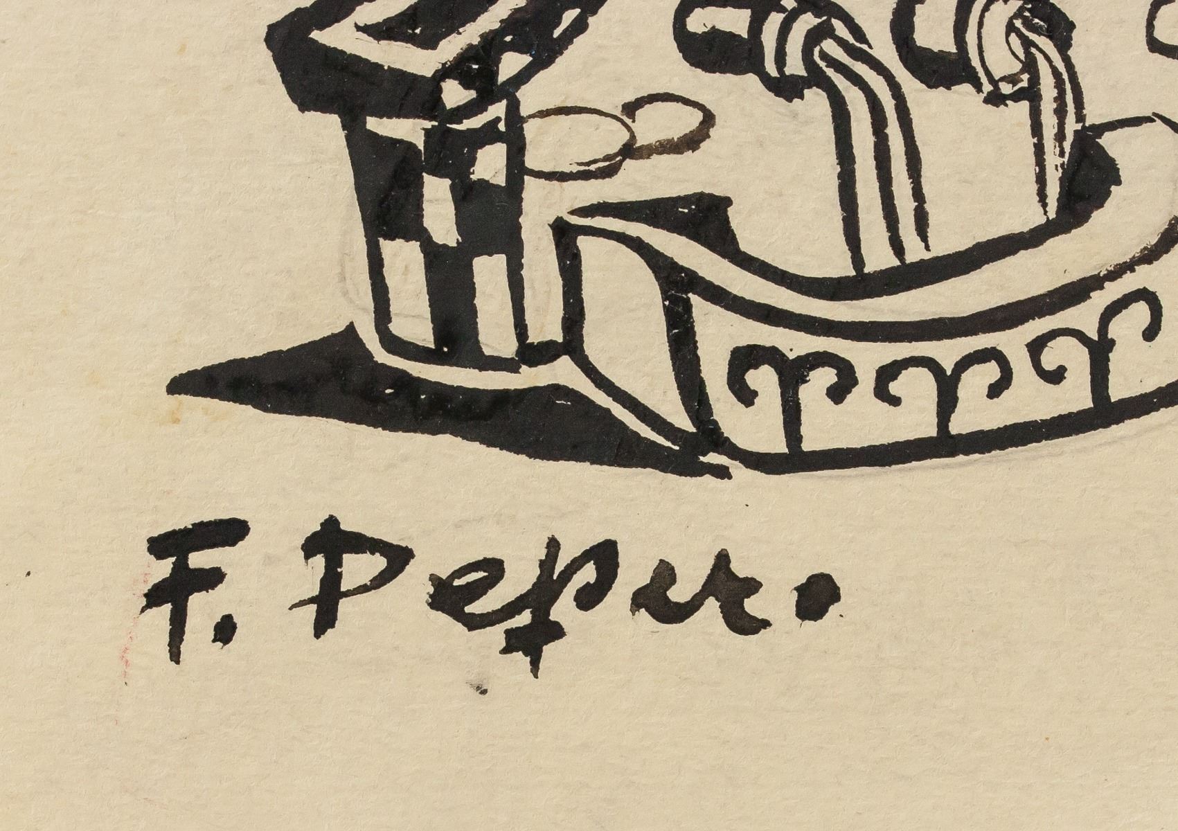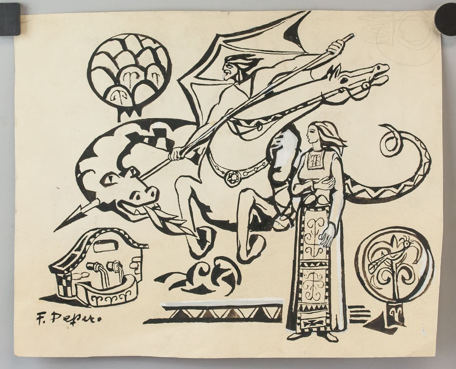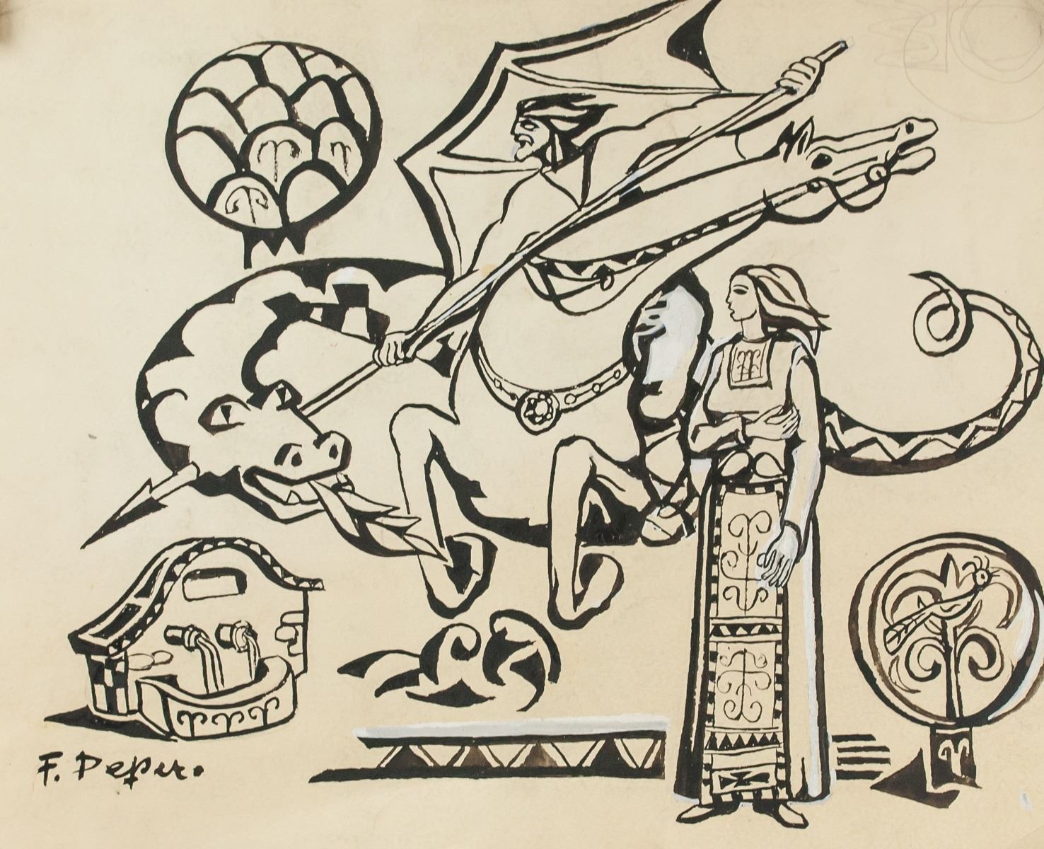 Mixed media on paper. Featuring surrealist scene of a man on a horse slaying a large snake while a woman watches from the side. Signed "F. Depero" in the bottom left corner. Attributed to Fortunato Depero (1892-1960, Italian). 26 x 31 cm (10 x 12.5 in). PROVENANCE: This lot carries limited provenance from a Southern Ontario estate