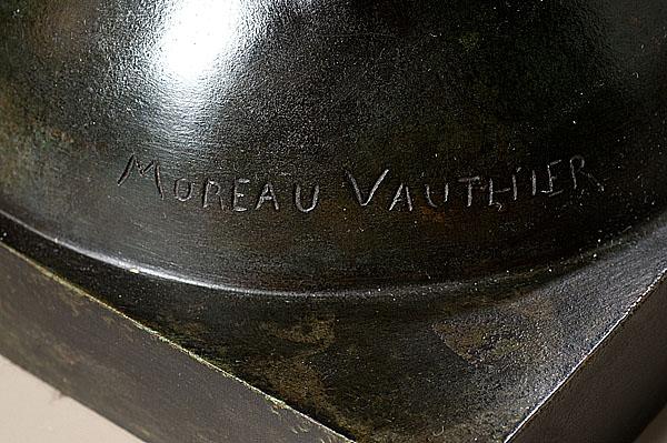 French, mid-19th century, bronze on bronze square attached base. Inscribed Moreau Vauthier on globe and with foundry mark, F. Barbedienne, fondeur. Circular mark on square base, Achille Collas Reduction Mechanique Brevette. This form by Moreau-Vauthier(1831-1893)is often titled Fortuna or Abondance; 33.625" high.