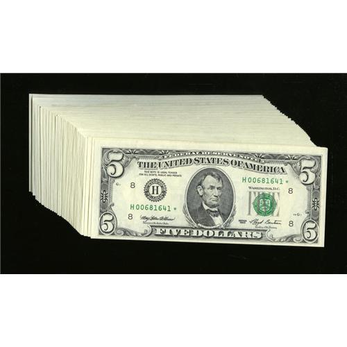 <B>Forty Seven Assorted $5s from 1974 to 1993.Q<BR>This group includes notes from the following Series, 1974, 1981, 1981A, 1985, 1988, 1988A, and 1993. The pieces grade <B>Choice About Uncirculated to Gem Crisp Uncirculated.</B></I> A couple of stars are present.<BR><BR><b>Shipping:</b> Coins & Currency (<a target="_blank" href="http://www.heritageauctions.com/common/shipping.php">view shipping information</a>)