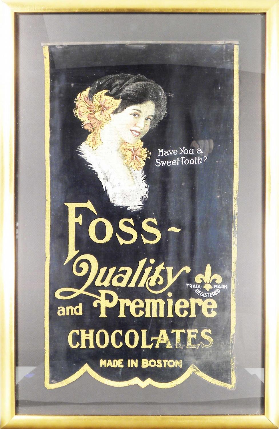 Early 1900 Foss-Quality and Premiere Chocolates Felt Banner. Entitled, "Have you a Sweet Tooth". Original metal band at top. Framed under glass. Some minor paint loss otherwise good condition. 15 1/2 X 29 inches image only.