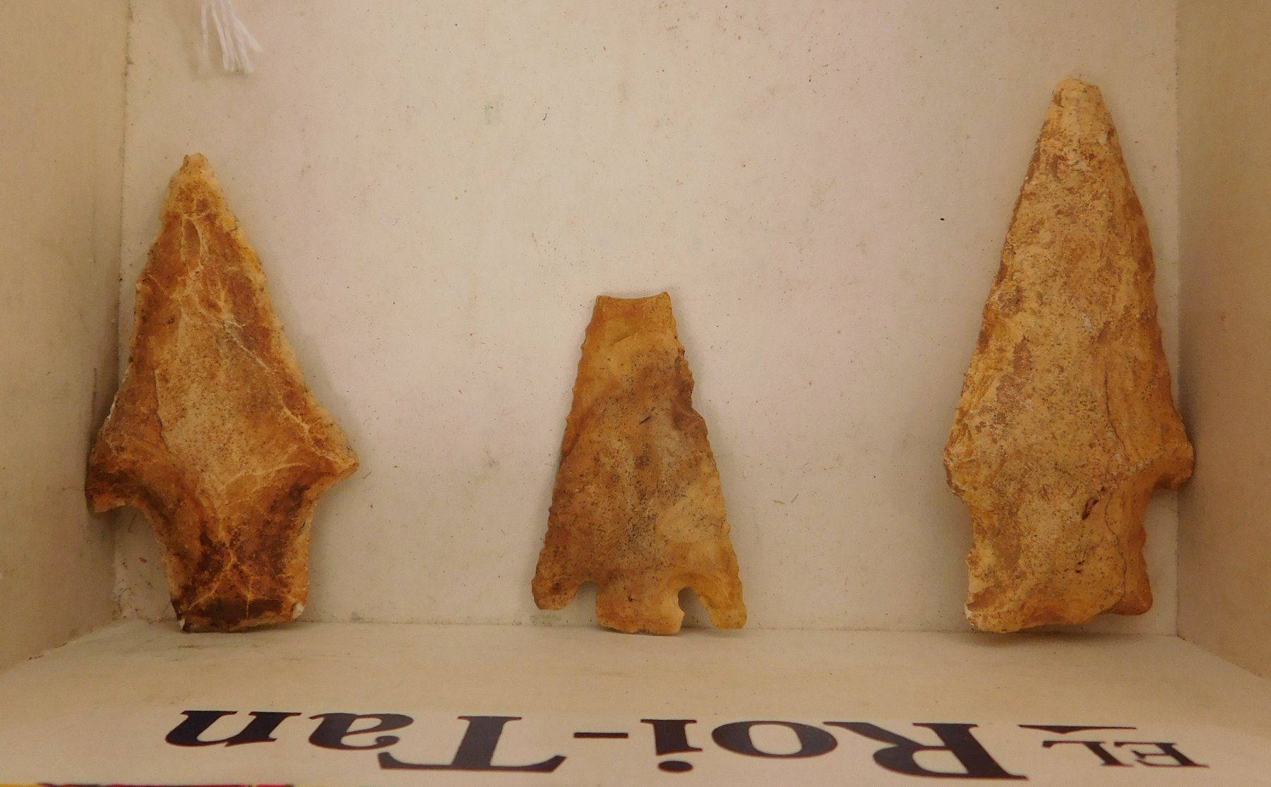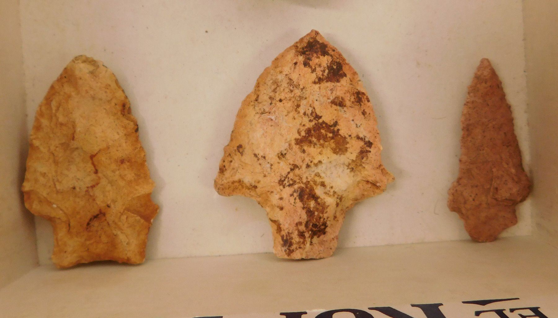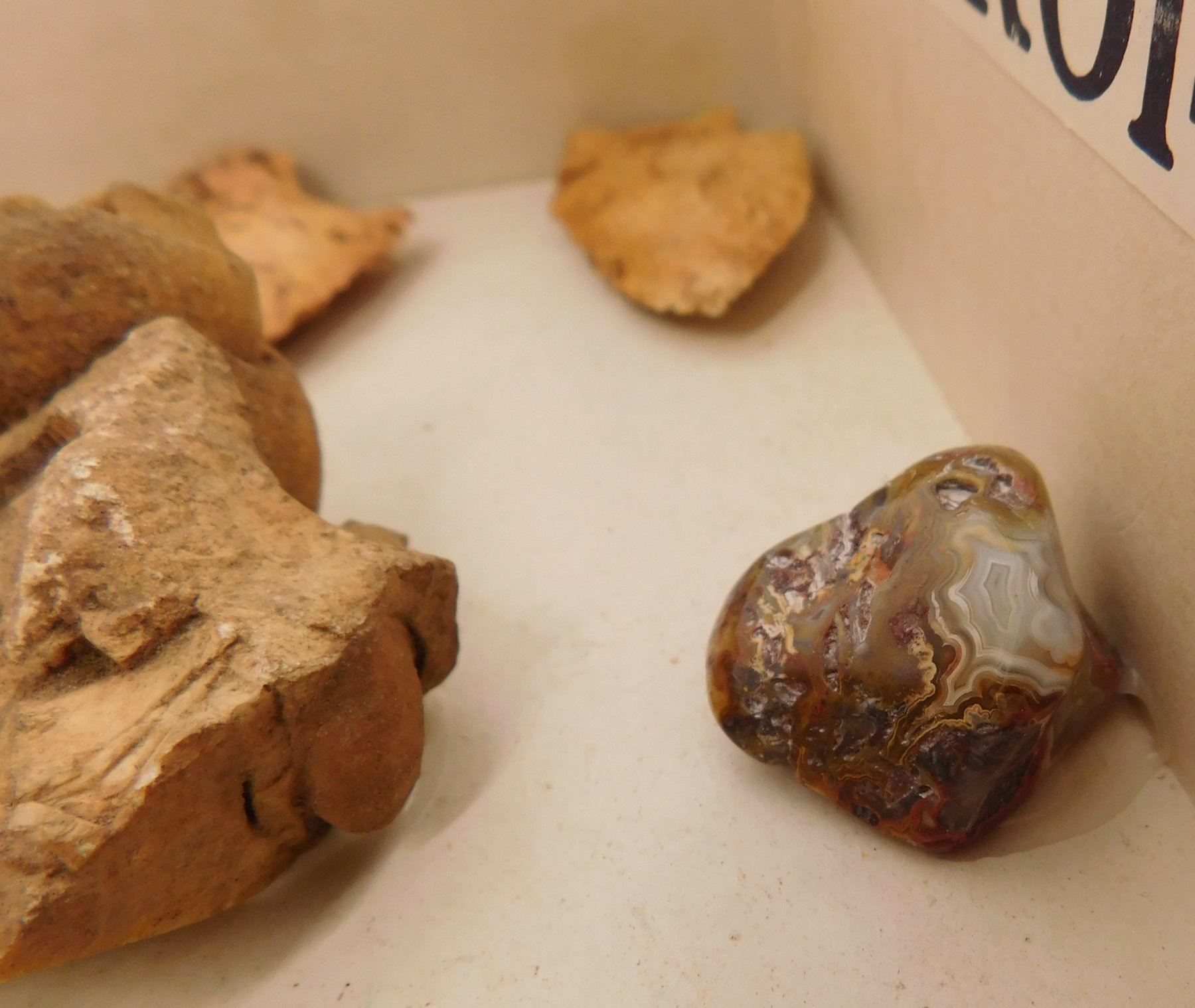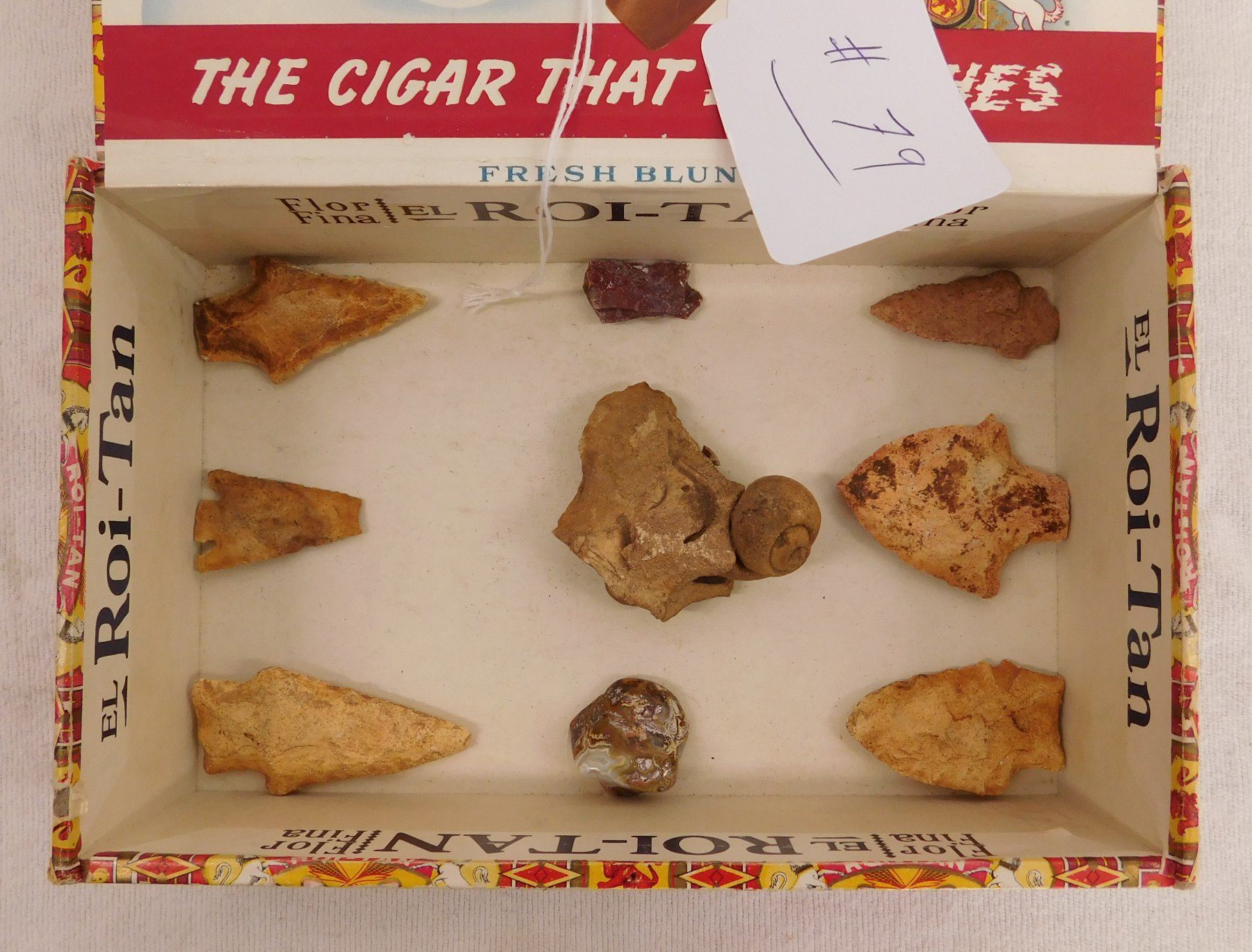 Fossil & Artifact Collection, artifacts c. 5000 years old. Made of chert and sandstone, the items measure from 1" to 2.5". Terrell County, Georgia. Box included. Condition: As found, see images. Shipping: $20.00 w/insurance and signature.