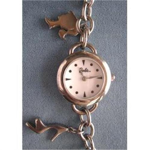 Silvertone Fossil Barbie watch and bracelet with five charms attached: a silhouette of Barbie's head, a shoe, a purse, a telephone and a pair of sunglasses. Barbie's name is written on the white watch face which has no numerals. On the back is written "Fossel Limited Edition" Barbie and the numbers 0486/2000 - meaning it is number 486 out of 2000 made. Keeps excellent time.