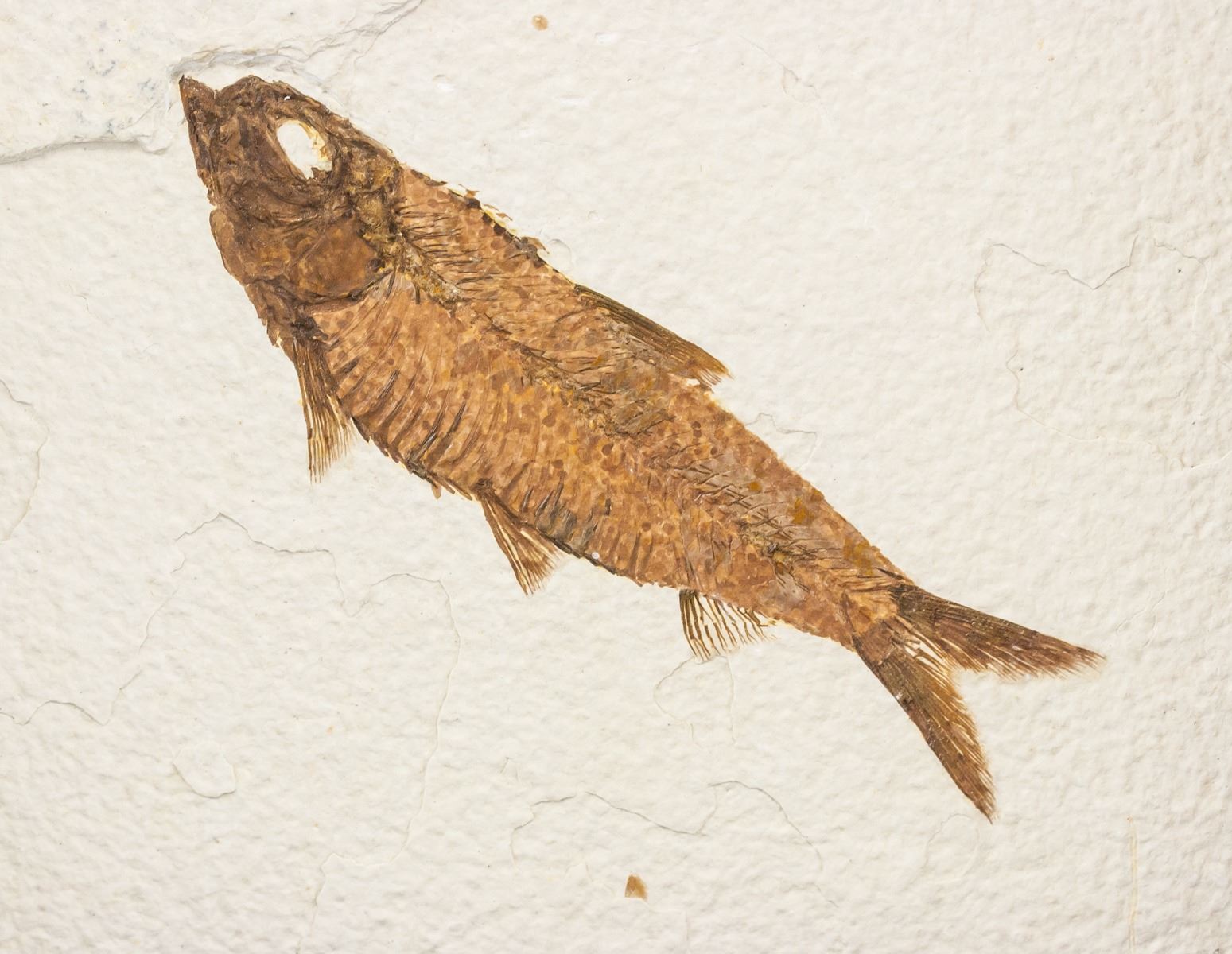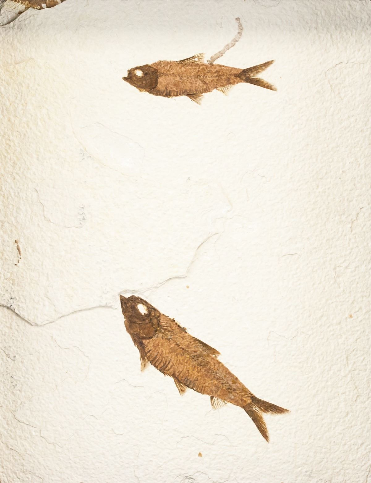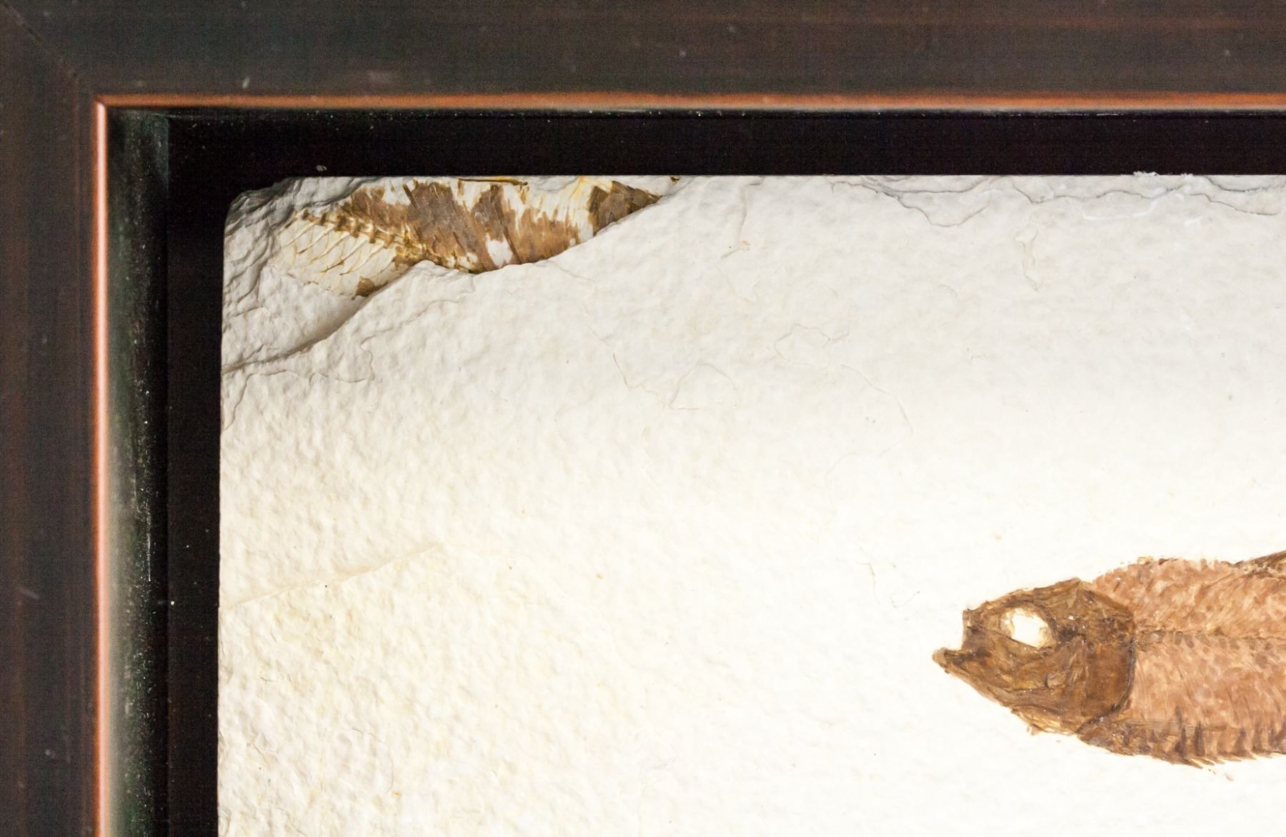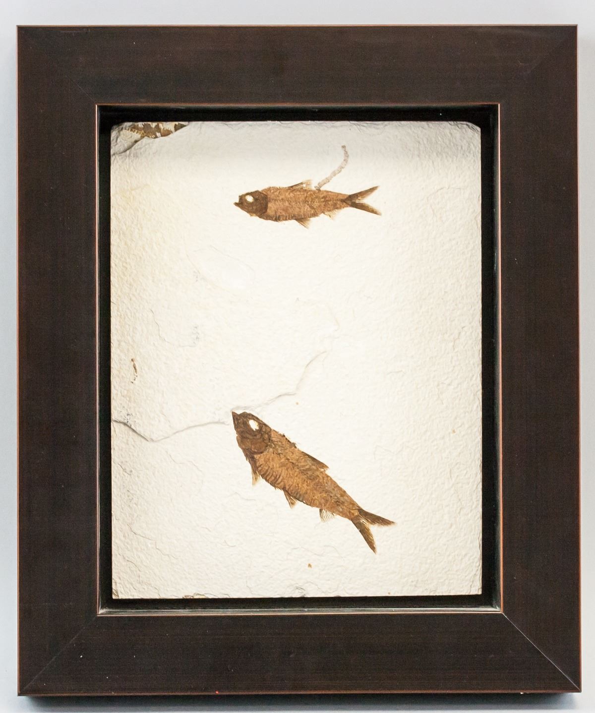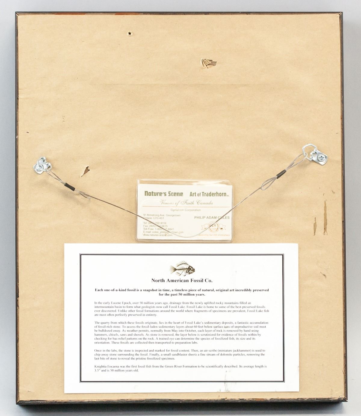 Fossil painting on stone, framed. Featuring two fossil-like fish painted brown. Business card on verso. Label on verso reads "Northern American Fossil Co." 20 x 25 cm (8 x 10 in), Frame: 31 x36 cm (12 x 14.25 in).