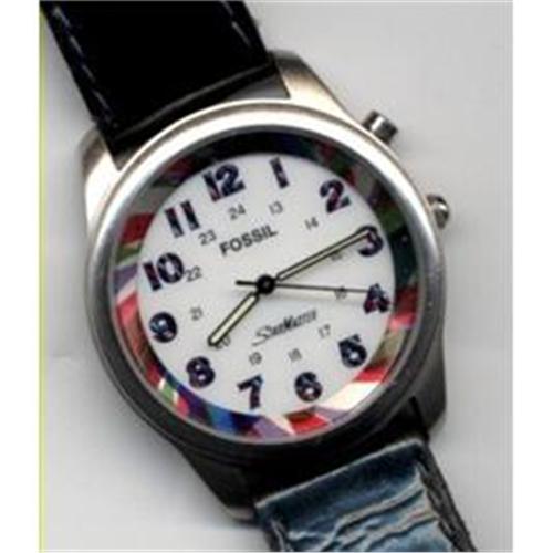 Fossil Starmaster Men's Water Resistant Watch with night light. The bezel is 1 1/4" in diameter. As you can see the outer perimeter is colorful. The numbers are colorful as well. The extra button just off from the crown is a night light button. It lights up the dial. <p> The condition is good. The watch works well and comes with a working quartz battery. <p>