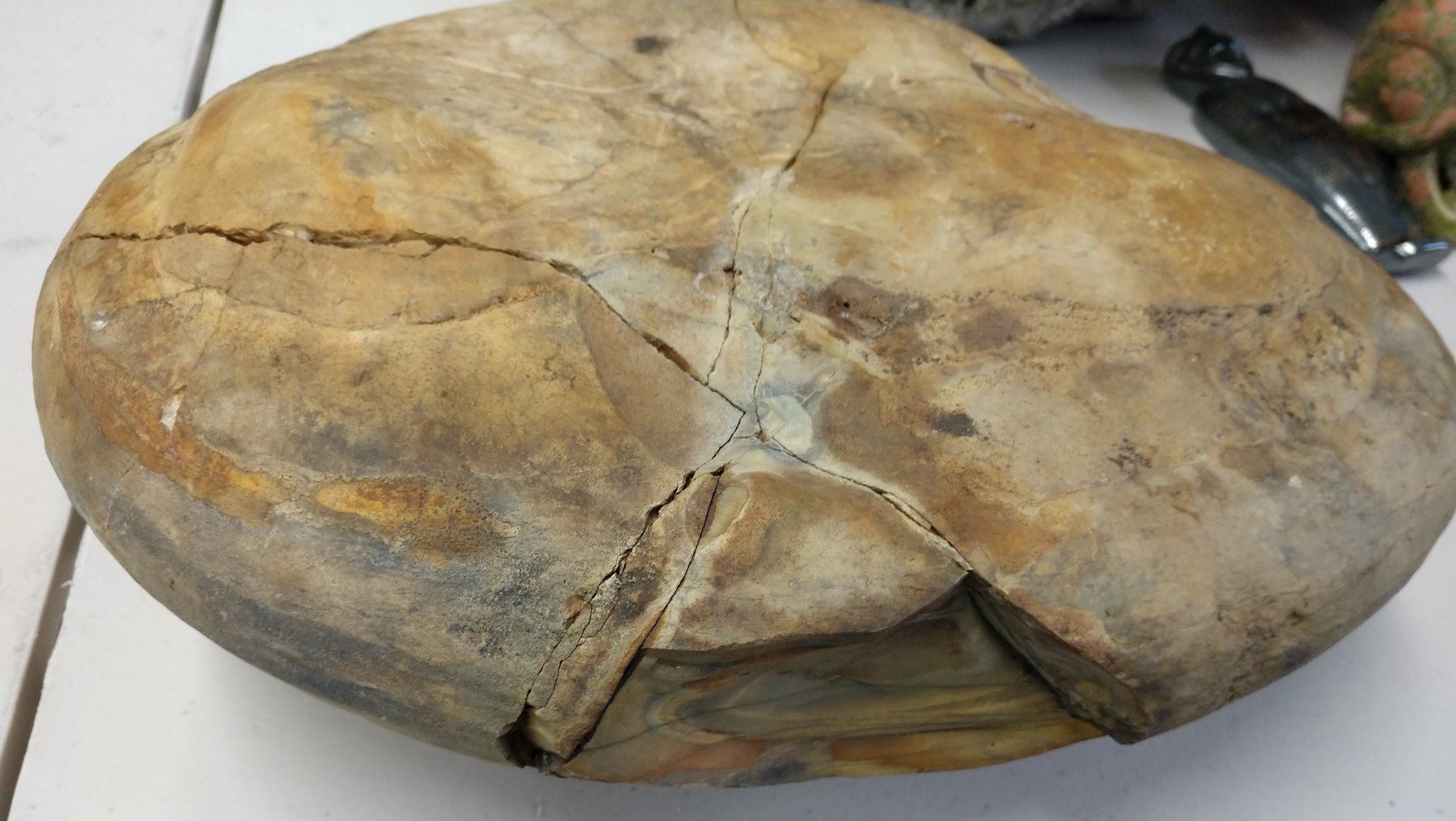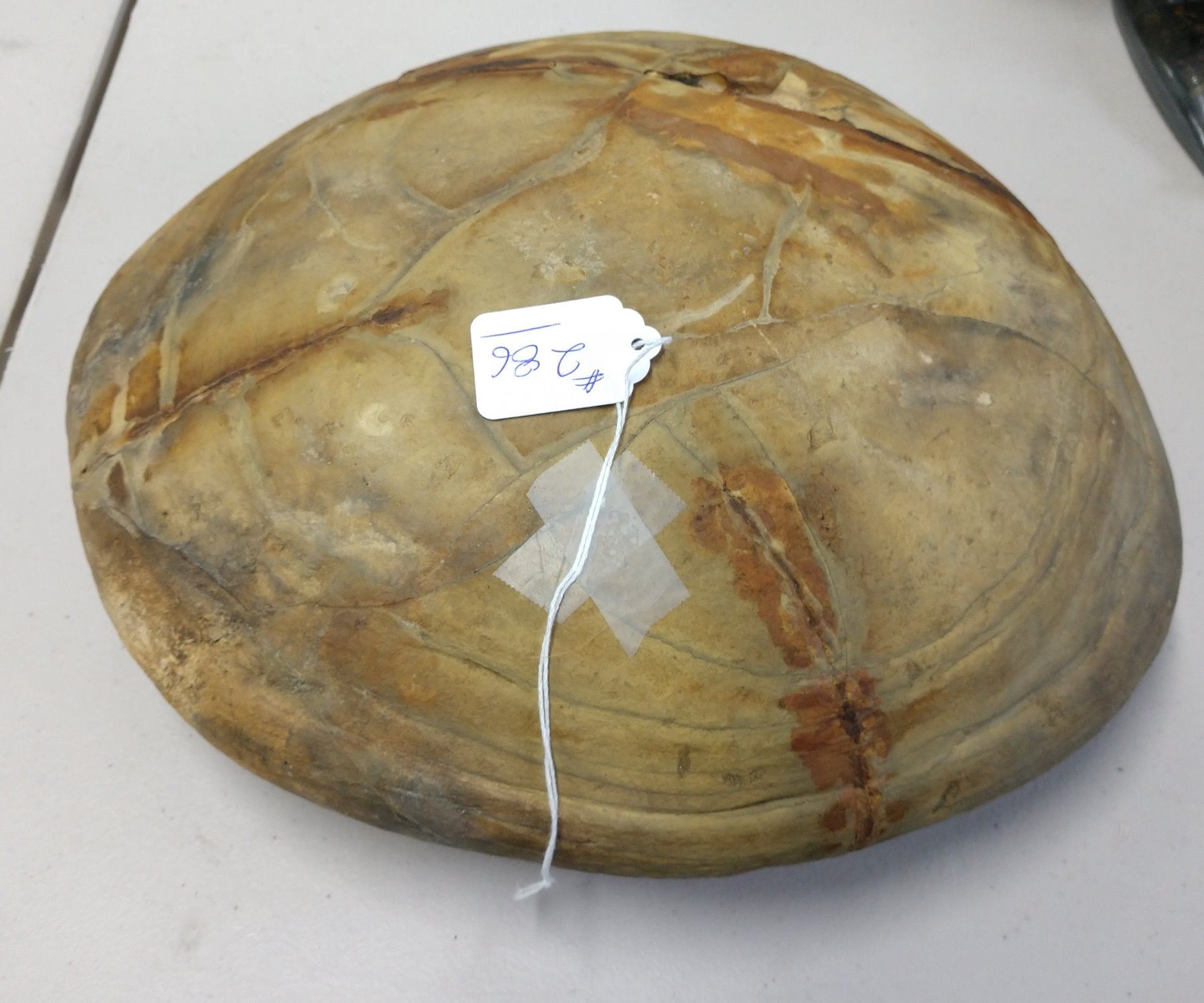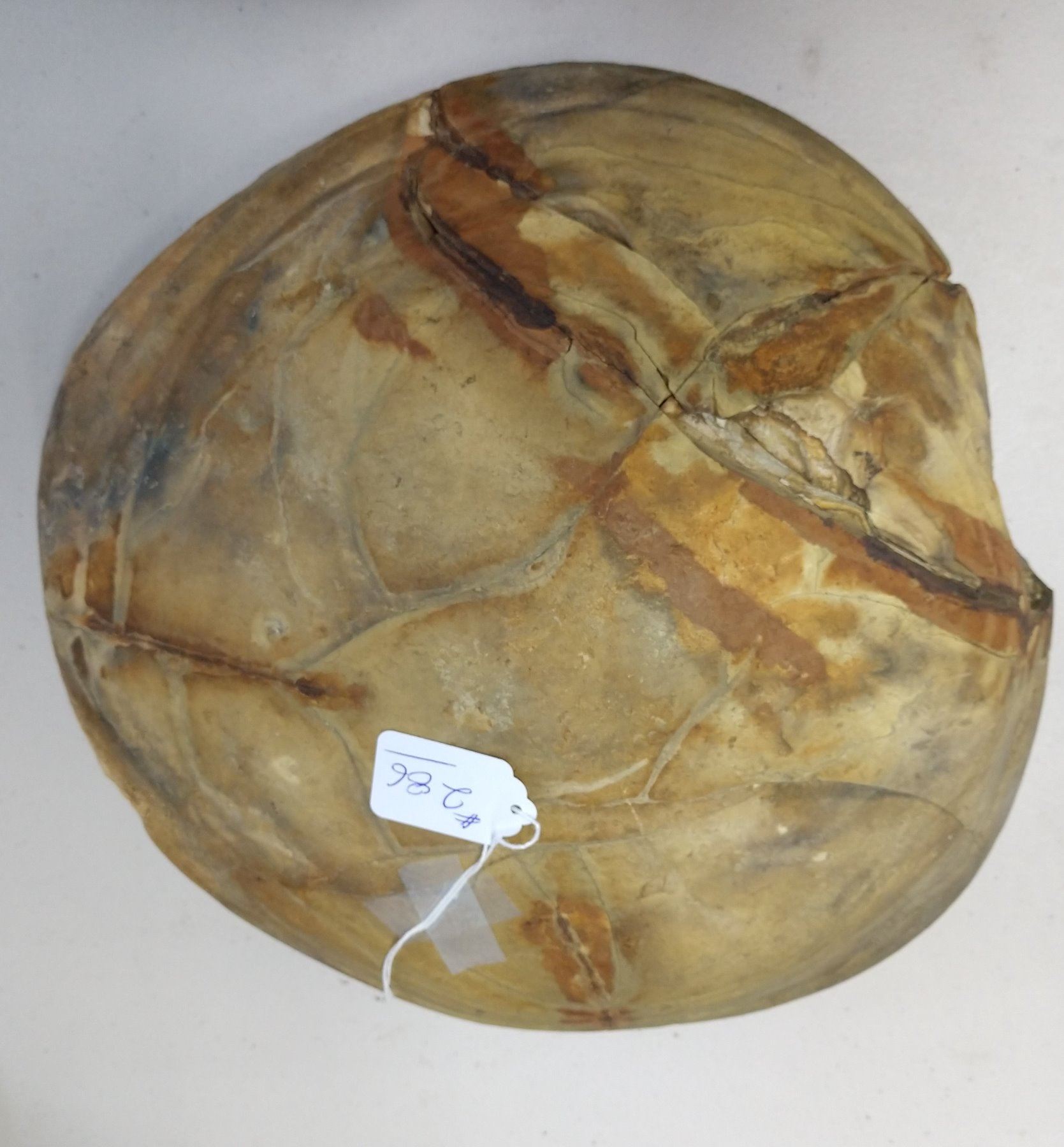 Fossil Turtle, pre-historic item. Made of sandstone, the item measures 12" x 12" x 5". Colorado. Weighs approx. 25 pounds. Condition: As found, see images. Shipping: $50.00 USA estimate only, due to size and heavy weight.