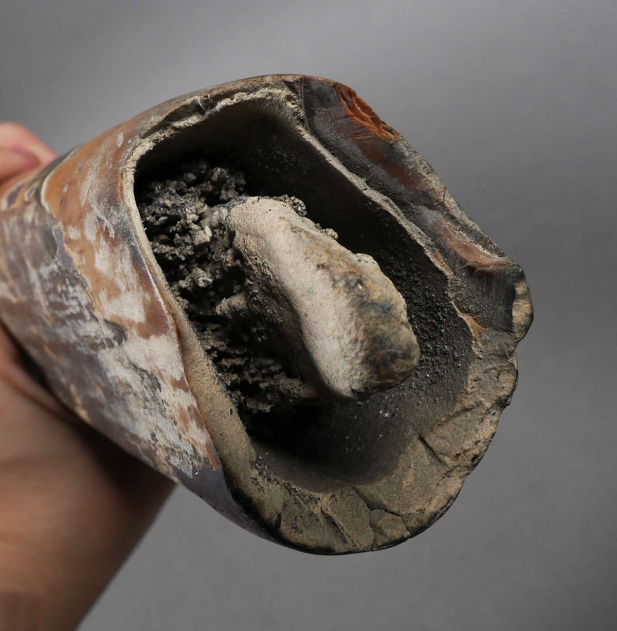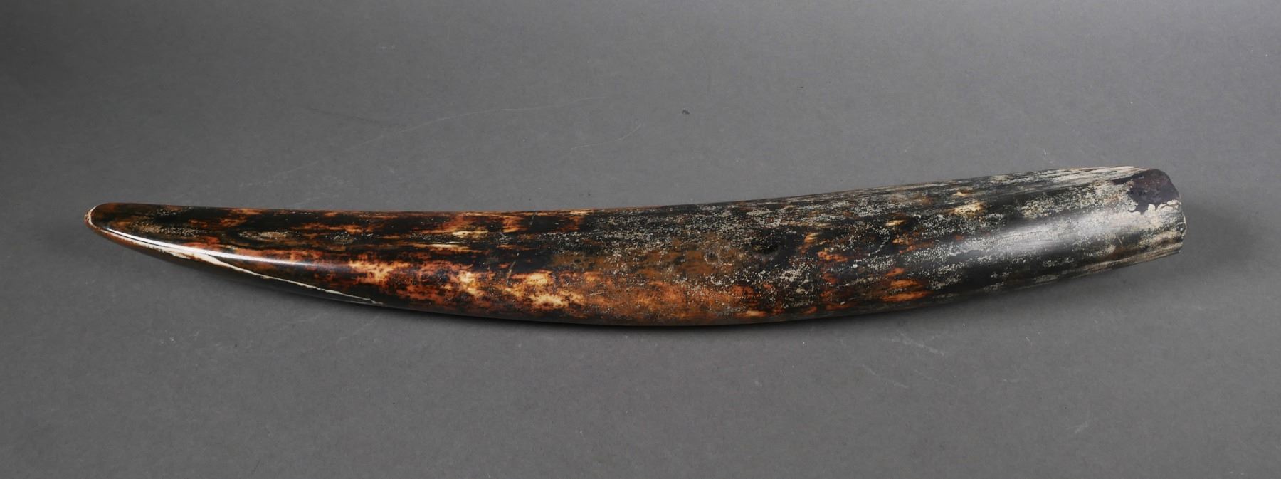 Fossilized walrus ivory tusk with variegated shades. Could be used for scrimshaw, carving, jewelry or knife handles. Approx. 20" x 2 3/4", 3.8 lbs. See our other auctions lots for more ancient walrus ivory tusks. PLEASE NOTE: Will not ship where prohibited by local, state or Federal law.