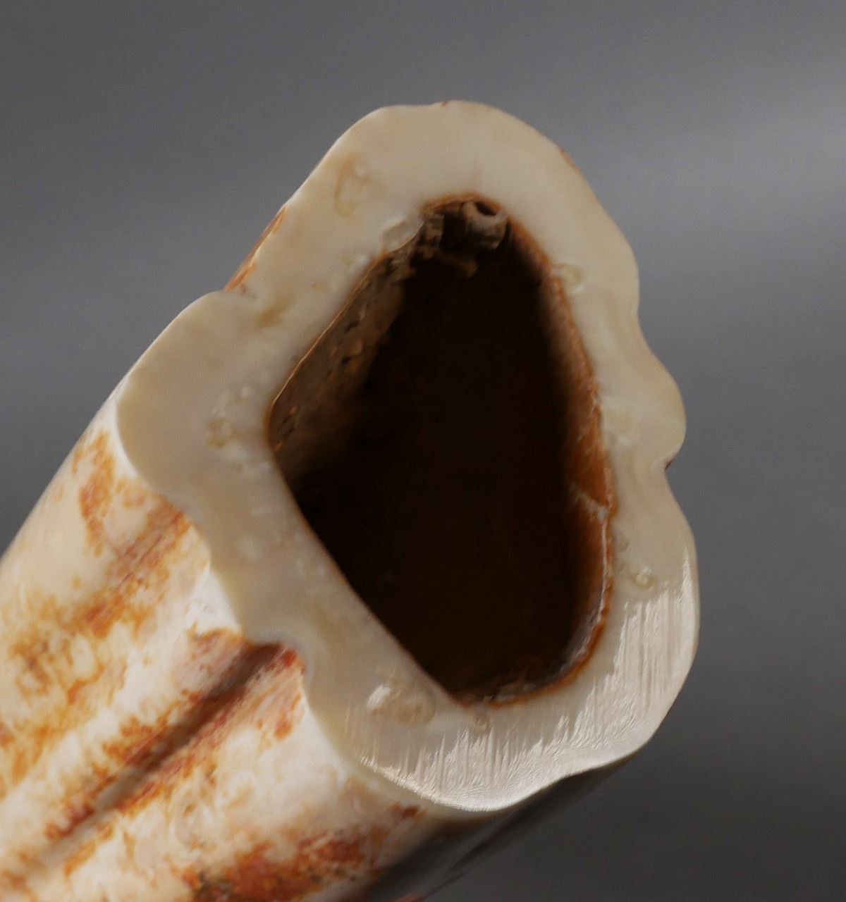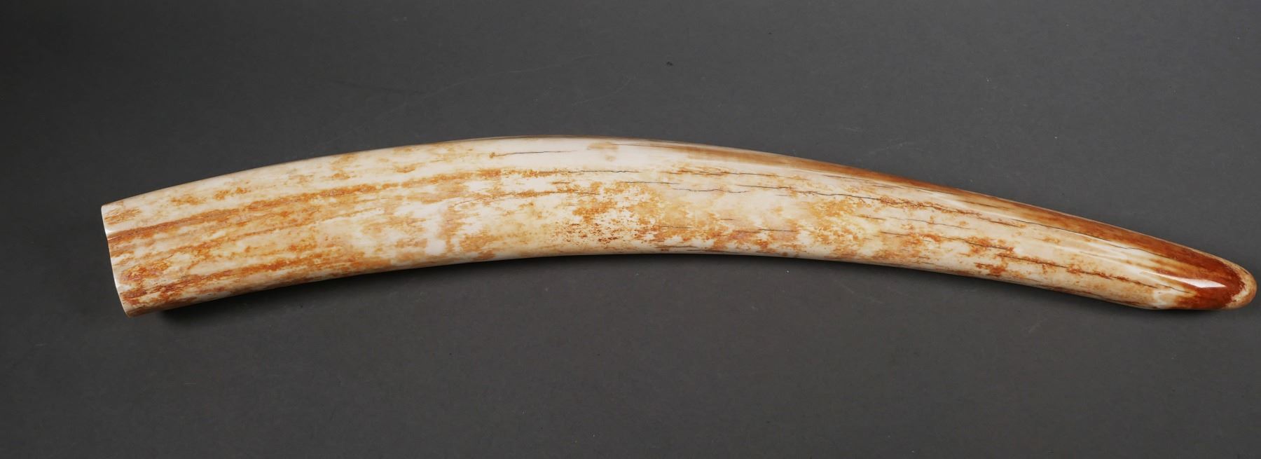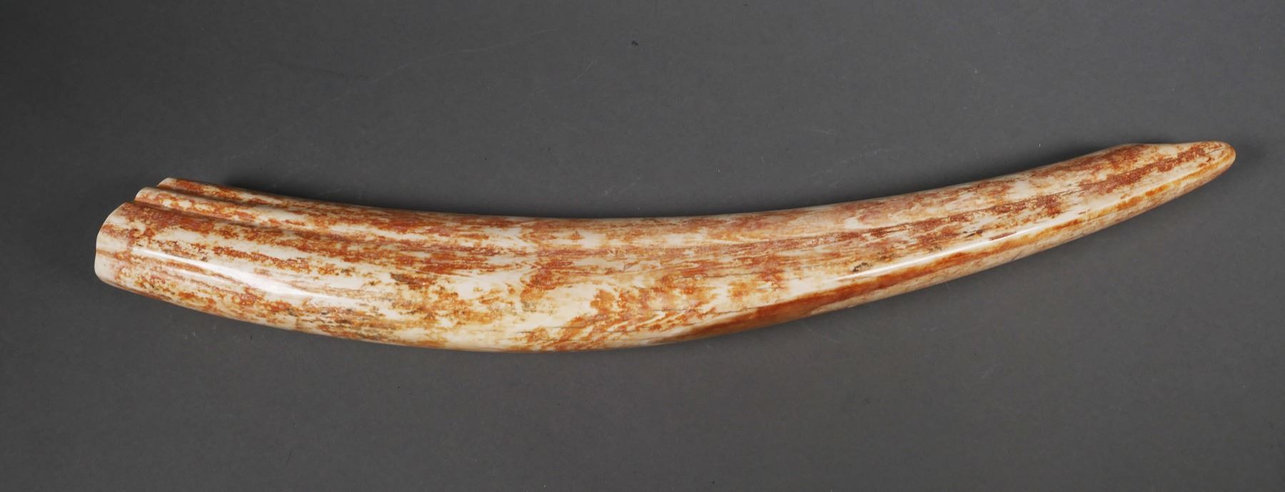 Fossilized walrus ivory tusk with variegated shades. Could be used for scrimshaw, carving, jewelry or knife handles. Approx. 22 1/2" x 3 1/8", 5.54 lbs. See our other auctions lots for more ancient walrus ivory tusks. PLEASE NOTE: Will not ship where prohibited by local, state or Federal law.