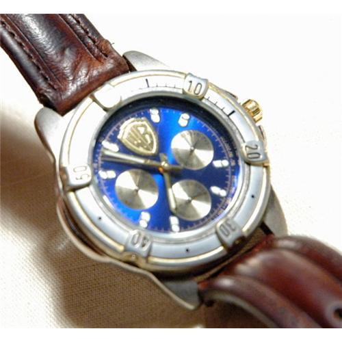 Excellent Fossil Watch that was made exclusively for Warner Brothers and Time Warner. The face is a beautiful deep blue. The dial for the time on the circumference has luminescent panels for the hours. There are 3 inner subdials. The subdials for for the day, date and military time. The goldtone hands for the hours and minutes have luminescent panels. There is a sweeping second hand. <p> The mat steel bezel rotates. <p> The case is 1 9/16" from crown the other side x 2 7/8 from lug to lug. The condition of the watch is suberb. <p> Then geniune padded leather band show a bit of wear mainly where the strap goes through the buckle.