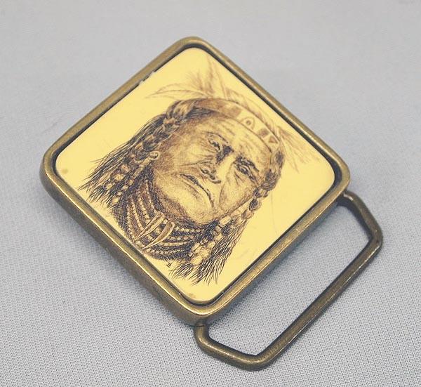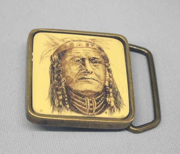 Fossilized Ivory Scrimshaw Buckle of Indian Chief. Set in brass buckle, measures 2''x2''. Includes card explaining scrimshaw history, from Ye Olde Scrimshaw & Nautical Co. Buyers Pay Actual Shipping and Handling Charges(see terms and conditions for more information).
