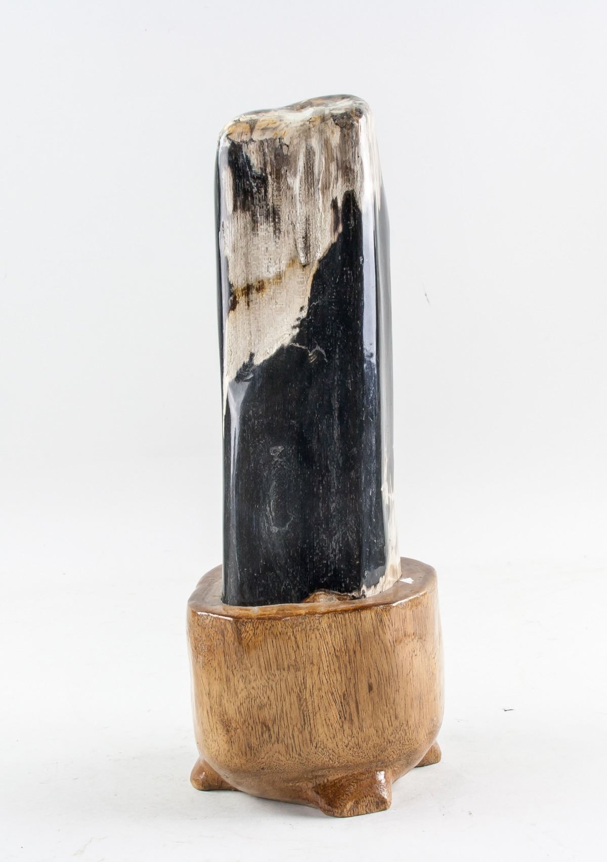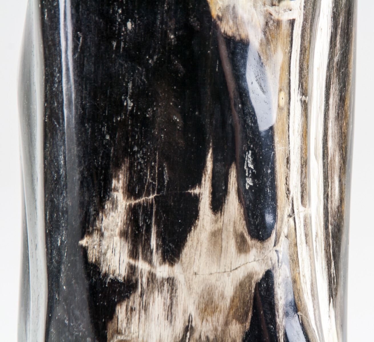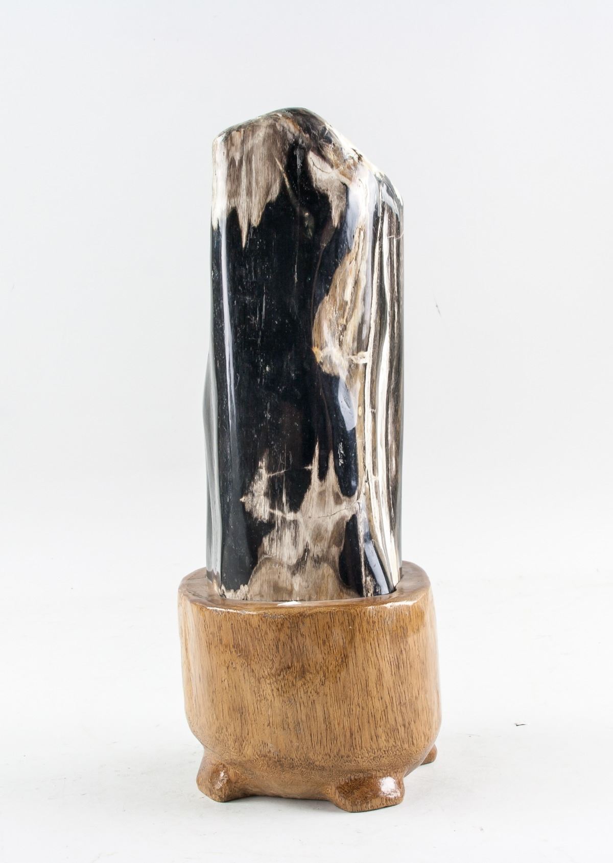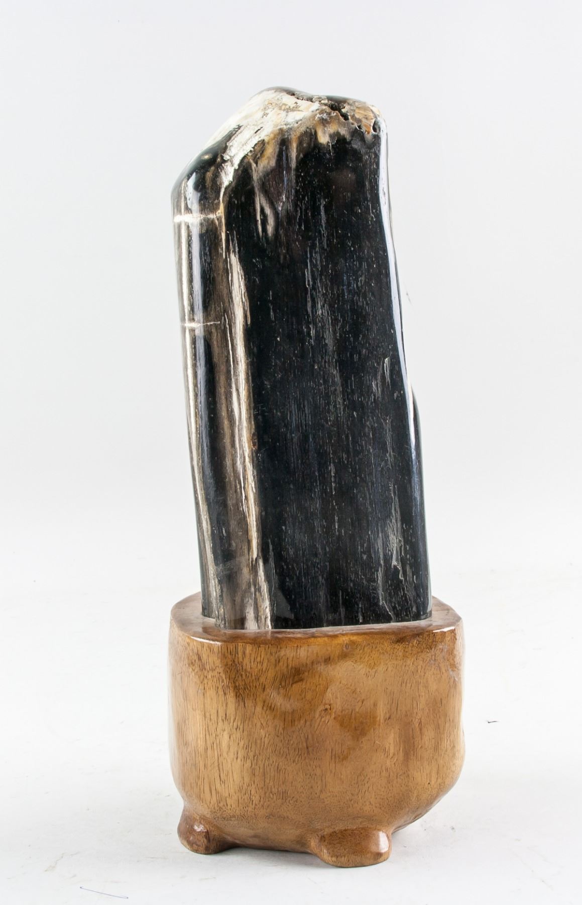 Wood fossil, of natural shape and stripes, with customized wood stand, 34 x 10 cm, 4 kg