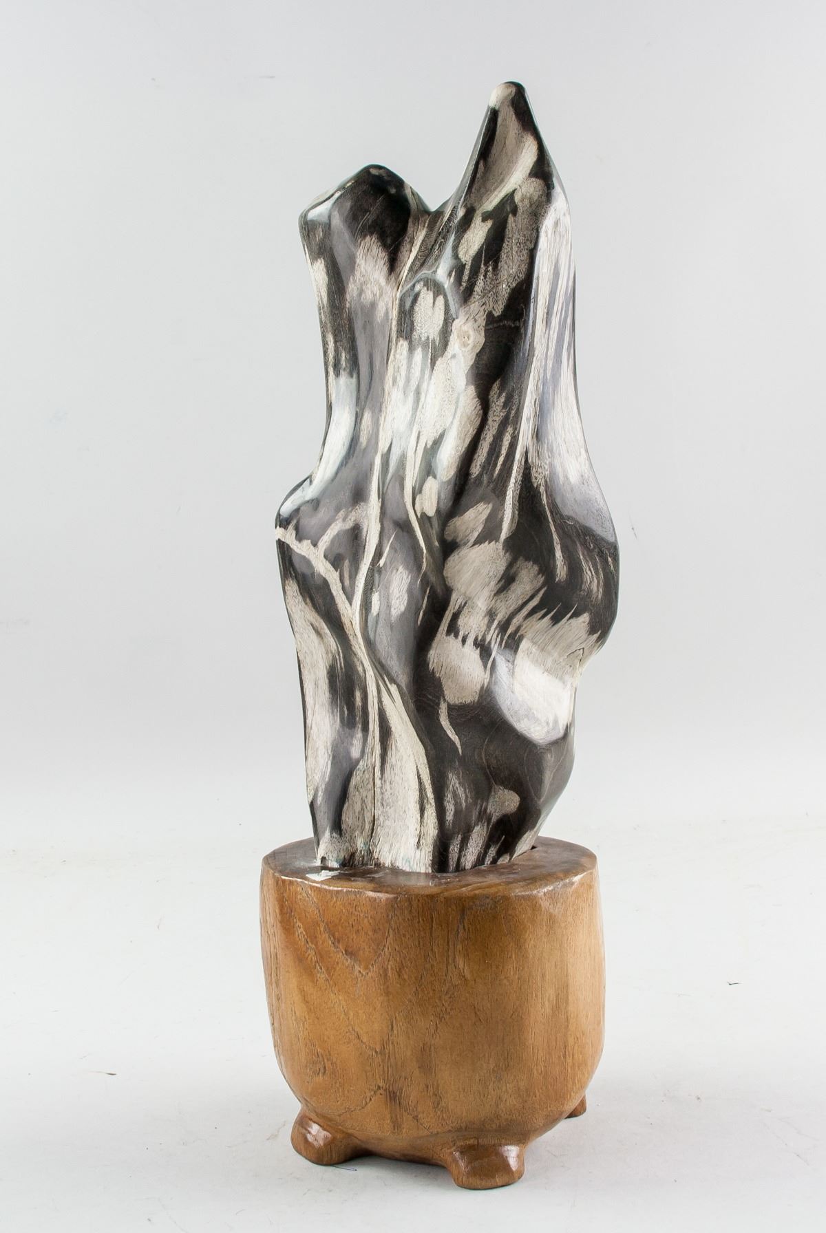 Fossilized wood, scholar's stone, of natural shape and stripes, with a carved customzed wood stand, 31 x 14 cm, 2906 grams