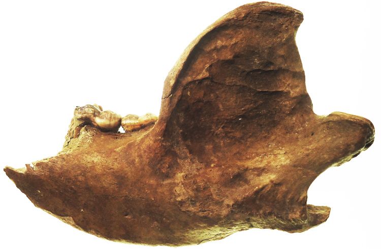 Fossilized cave bear jaw segment with two molars, approx. 200,000 to 20,000 years old.
