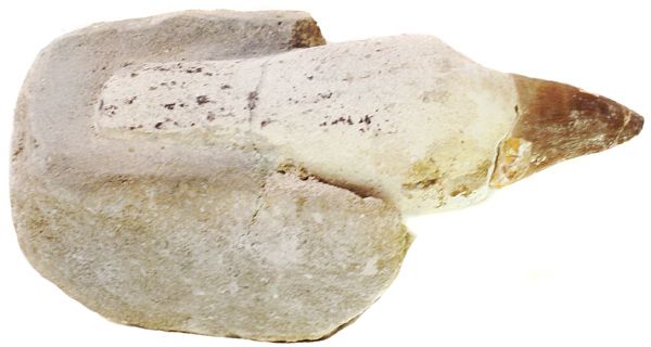Fossilized dinosaur tooth (mosasaur) with root in matrix (repaired), from Khouribgha, Morocco, approx. 65-146 million years old. 480 grams, roughly 6-1/2" x 3" x 3". A somewhat shark-like brown tooth with broken-off tip and small pieces of the dentin missing, but with full, long (white) root protruding from the side of concrete-like sandstone, with a space carved out from the matrix behind the root to show its other side, repaired crack visible on the front.