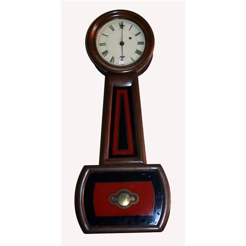 Foster Campos Banjo Clock having a rosewood finish case, 8-day time only, weight movement, original weight and pendulum, painted tablet. Measures 29" H x 12" W x 3 3/4" D.
