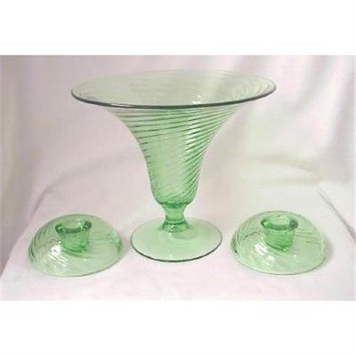 Bowl and Candleholders in Green Swirl Pattern by Fostoria. 1921-1929. Bowl 8 1/2" x 8", Candleholders 4 1/4" x 1 1/2". Excellent Condition.