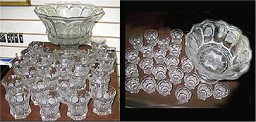 Fostoria Coin Punch Bowl with Stand and 24 Fostoria Coin Tumblers. The Tumblers stand 3 1/2" tall. The Punch Bowl stands 11 1/4" tall on base and measures 14" across. No chips or cracks, no ladle