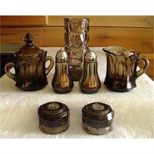 Giftware by Fostoria in Glacier Brown includes 7" vase and 2 candleholders. The creamer, covered sugar, salt and pepper are also Fostoria Brown, but I believe they are in the Virginia pattern. Beautiful pieces and in excellent condition.