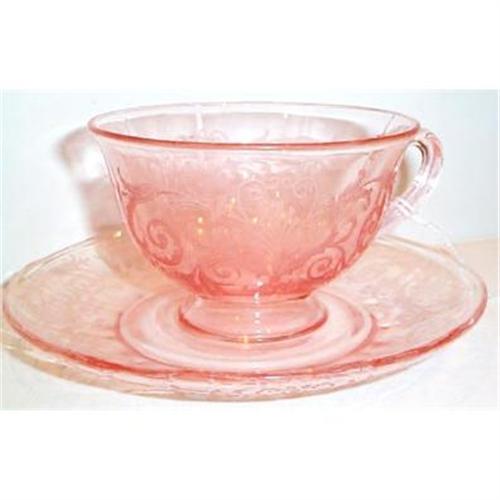This very lovely Pink Versailles Decorated Cup and Saucer are both in SUPERIOR condition with no chips, cracks, dings or scratches. The cup measures 3.75" in diameter and stands 2.50" tall and the saucer is about 5.75" in diameter. Versailles was manufactured by Fostoria Glass Company c: 1928-1944.