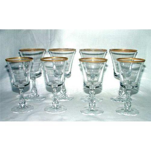 Marked Fostoria, 4 water goblets and 4 claret wine stems in the Richmond pattern. Water goblets are 6.75" tall and the claret wines are 6". No nicks, chips or cracks. Water goblets have some loss of gold trim from use, but the claret wines are practically new. Just beautiful.