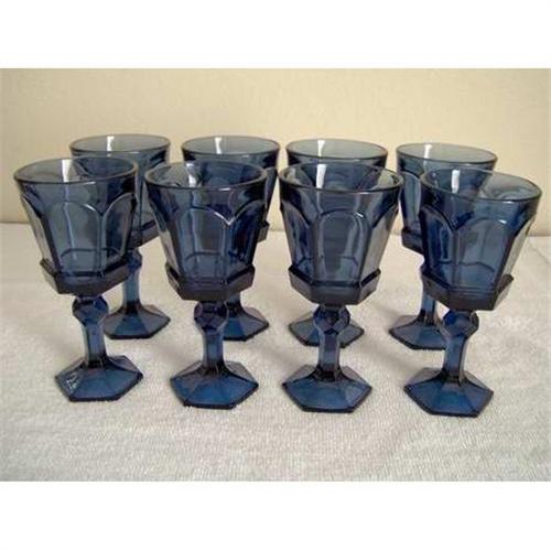 8 dark blue claret wines by Fostoria in the Virginia pattern. Nearly new condition with no nicks, chips, cracks or discoloration. Just beautiful.