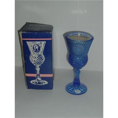 Fostoria-The Washington Goblet Candleholder. Made by AVON 1975-77. Elegant Fostoria glass goblet, designed with a frosted medallion portrait of President Washington. A splendid Bicentennial commemorative collectible. 8 inches tall, 3 1/2 inces in diameter, comes with a Frankincense and myrrh perfumed candle. Mint In Box. Box has some wear & tear.
