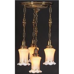 Fostoria chandelier, four shades with pulled feather decoration in green, gold and white on a turn of the century brass fixture, unsigned 14”dia. X 28”h, excellent condition
