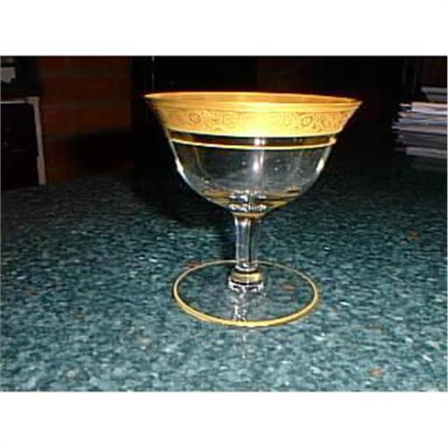 1930s Fostoria sherbet glasses in the Regent pattern. Set of 10. Very good condition, no chips or cracks or worn gold. Glasses measure 3.75" high by 3.75" wide at top of glass.
