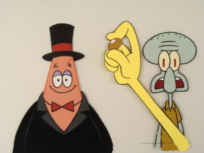 This original animation cel is from the Nickelodeon TV show SpongeBob Squarepants. The story takes place under the deep blue sea in Bikini Bottom, where SpongeBob resides. SpongeBob, who is a yellow, porous sponge, is your typical happy-go-lucky character, as he is always cheerful and enjoys making people laugh. Patrick Star, SpongeBob's neighbor who is a starfish, is your average children's show idiot, as he boasts knowing nothing and is often getting himself into ridiculous situations. Between the homes of these two lies the home of the miserable Squidward, a squid, who is known for being grouchy and playing tricks on SpongeBob and Patrick. Both SpongeBob and Squidward work at the Krusty Krab, a fast food business run by the greedy money-loving Mr. Krabs, a crab, the arch rival of the evil, possibly misunderstood, Plankton. Another neighbor, Sandy Cheeks, an athletic squirrel who normally wears an astronaut's space suit, was introduced in "Tea at the Treedome." She spends most of her time inventing and experimenting. In this cel, Squidward seems to be quite upset in what is being held in front of him.Original Production Animated Cel Overall Size of Cel: 10 1/2" x 12 1/2" Excellent ConditionThis is an original hand-painted cel set-up used in the production of an episode of "SpongeBob SquarePants." Each one-of-a-kind set-up represents a slight change in position of the characters. When individually photographed and projected in rapid succession, the images appear to move.