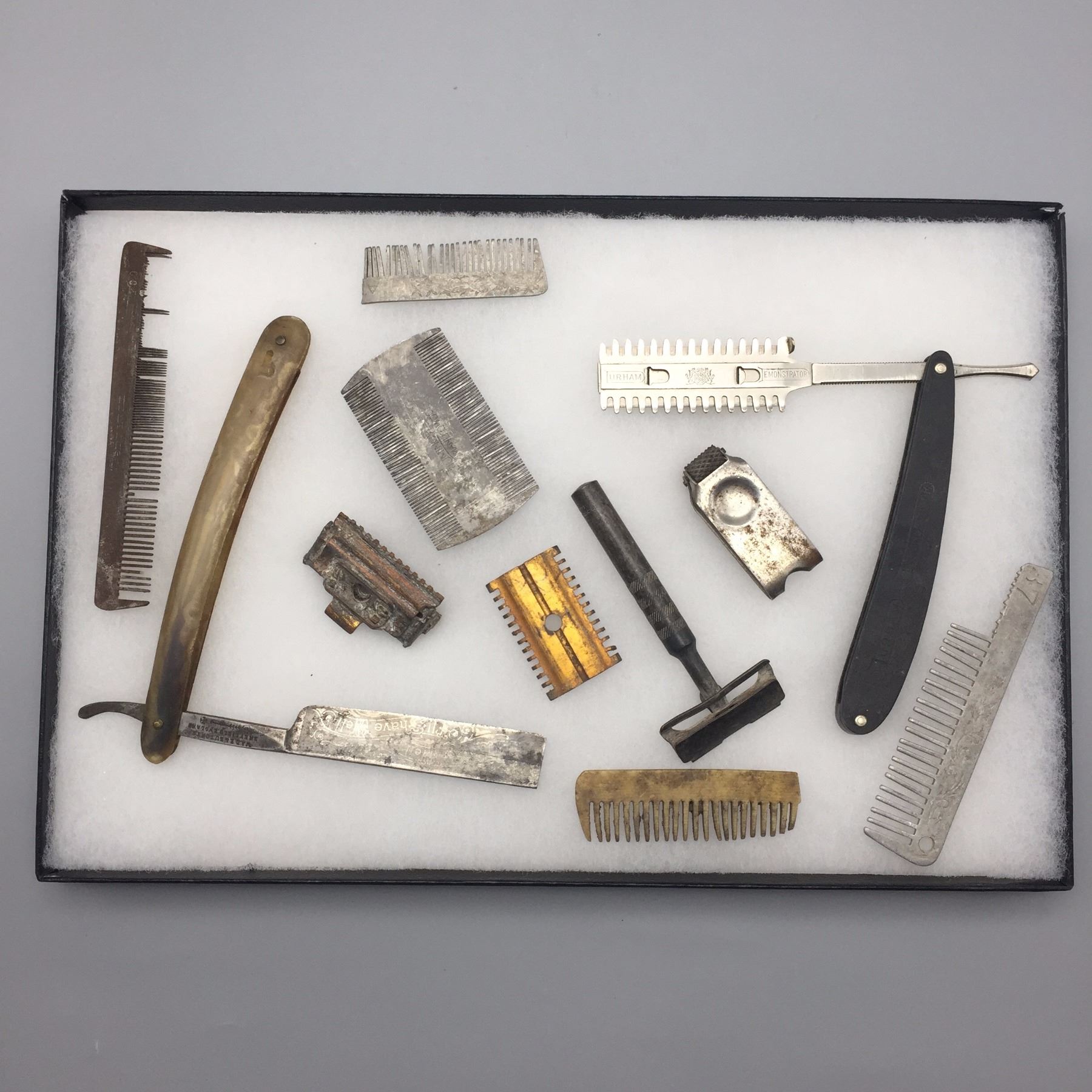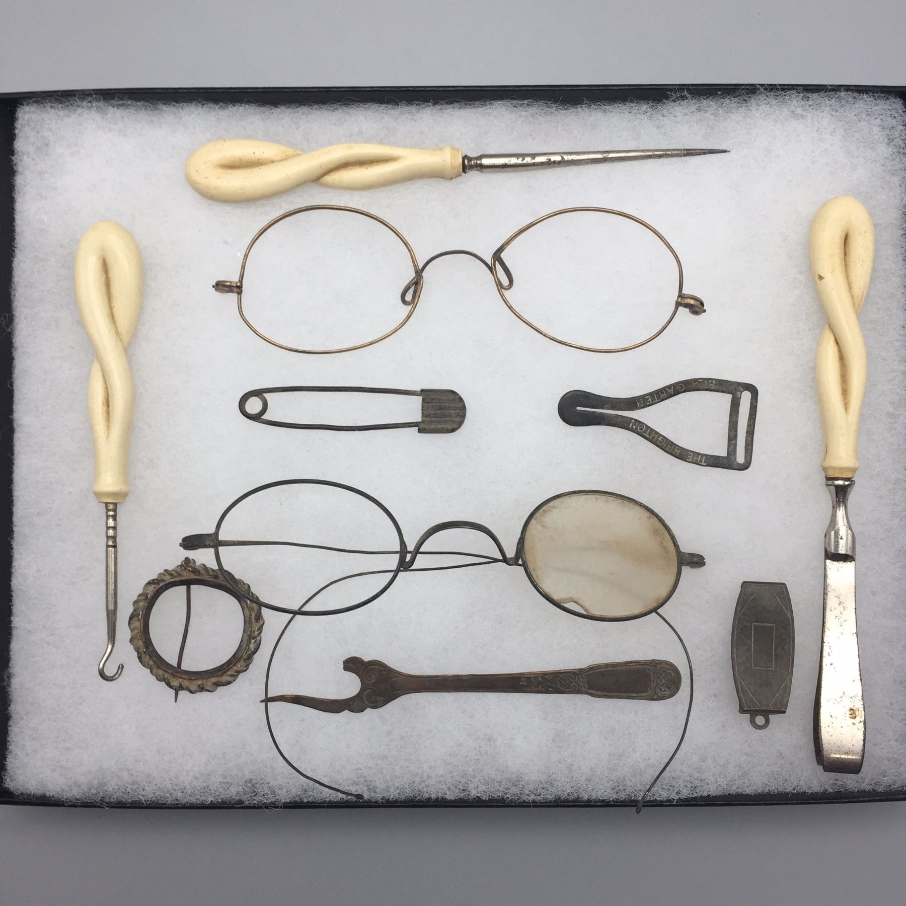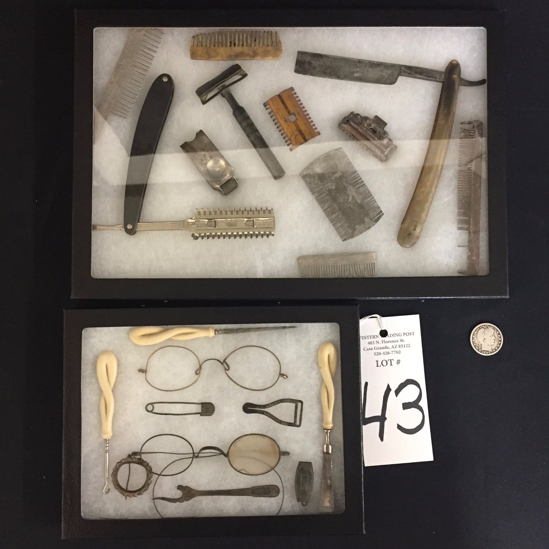 Maker: Various. Approx. Age: Antiques. Size: Display boxes are: #1) 8 1/4” x 6 1/4” and #2) 12 1/2” x 8 1/4”. Additional Info: Found relics from the Frontiers Relics Museum displays. Old vanity items and eyeglasses. Orville Mickens was a renown treasure hunter who opened the museum with relics he found treasure hunting around Southern AZ and NM. Condition: As Found. Not perfect, but dug and found relics. Please look closely at the pictures - they are an important part of our description. Shipping: There will be a $7 handling / packaging fee for shipping this lot. The actual cost of postage will be added on top of that.