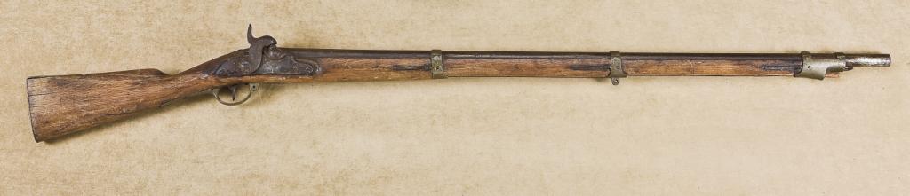 Found with above lot. German federal musket by Potsdam armory, .69 caliber smooth bore, 41-1/2” barrel, 56-1/2” overall, brass mounted, relic condition, buttplate stamped 1832. The right side of the butt at the rear is carved with the initials “L.P.” and there is a company type marking with the letter “D” at the left rear of the buttstock. The metal surfaces are heavily rusted and pitted. The markings are barely visible, the action is not working, the stock is weathered, and shows some large losses, and the swing swivels have been removed and one lock plate screw is missing. Has a similar dry patina appearance as the last lot as it appears to have been stored in an attic. Est.: $400-$800