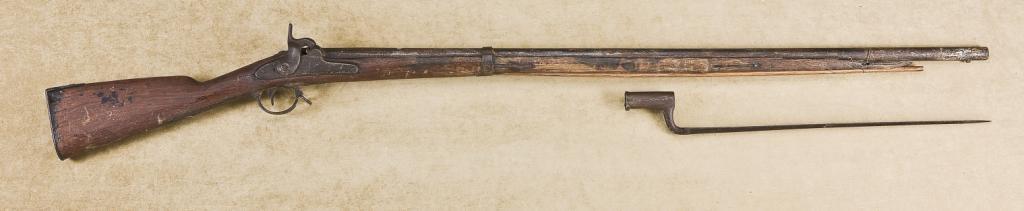 Found with above lot. Springfield model 1848, .69 caliber percussion musket in relic condition with bayonet. The metal surfaces show a light to heavy erosion and pinprick pitting, the markings are faintly visible, the stock is weathered and worn with many large losses, breaks to the forend, and the barrel has been wired to the stock. The associated bayonet shows a matching patina and the relic has been uncleaned and untouched in modern times and matches the other two arms found with it as to its patina. Est.: $400-$800