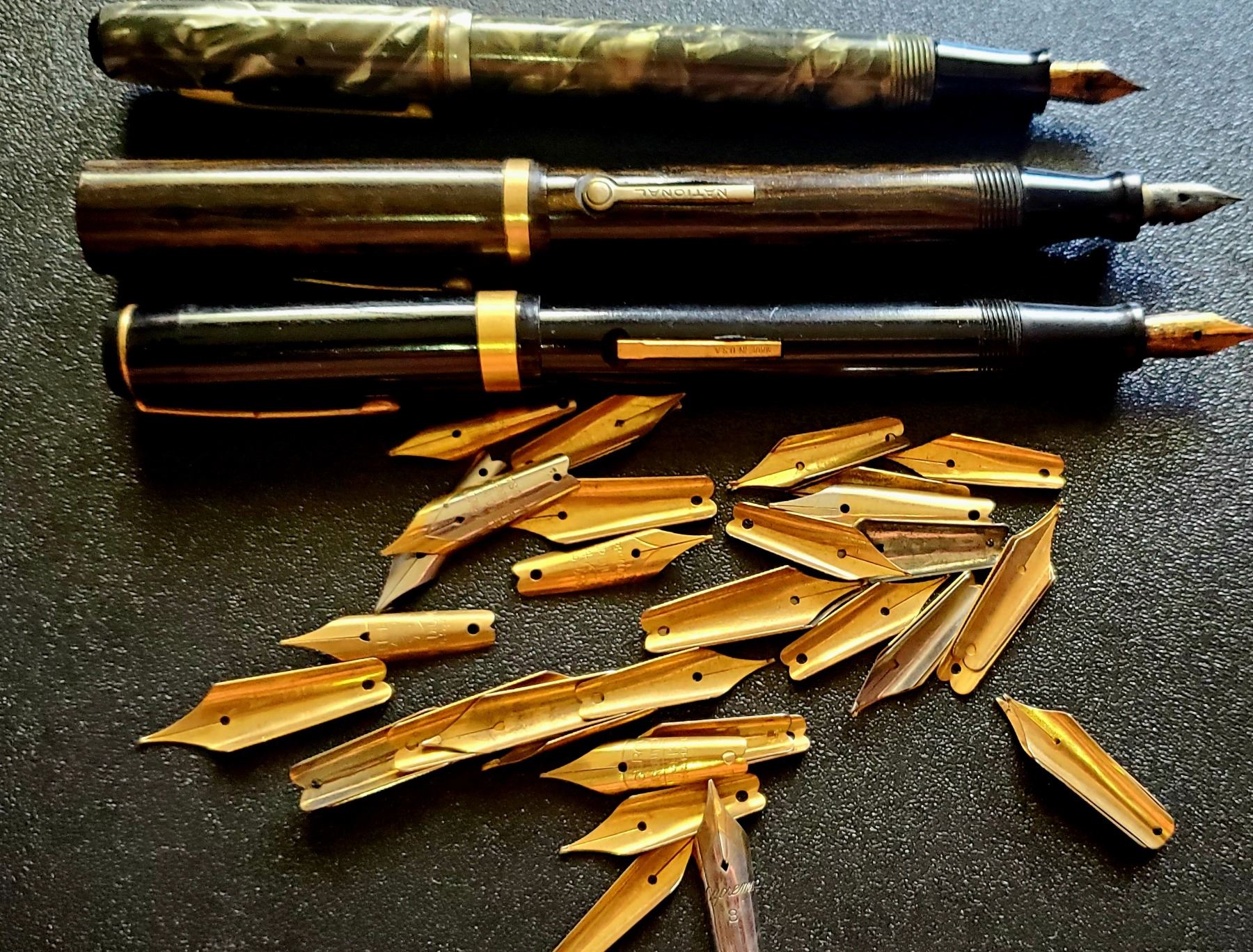 3 Fountain pens and 14k gf Nibs. (1) Everlast, Marathon and Pioneer pen with Nibs and (35) replacement Nibs. Various conditions but overall in Good condition.
