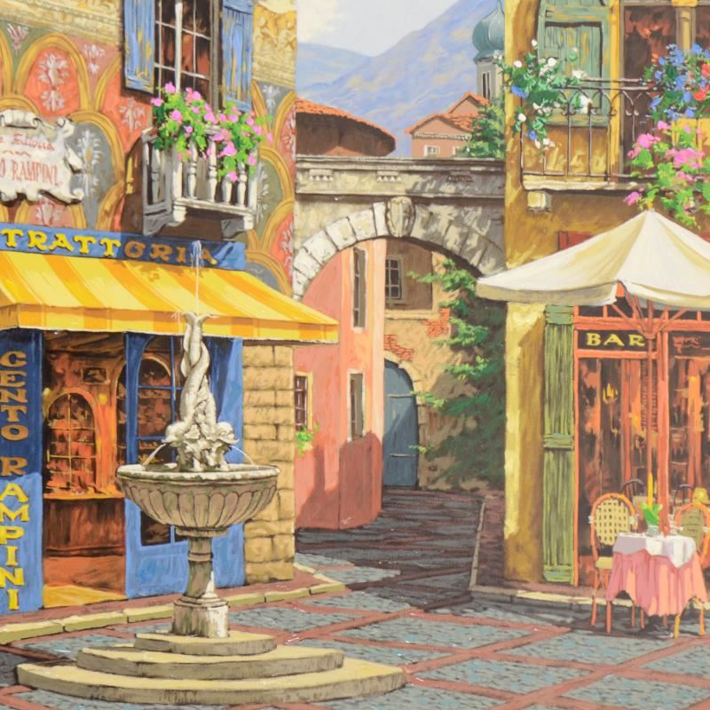 "Fountain in the Square" is a limited edition hand embellished serigraph on canvas by Viktor Shvaiko, numbered and hand signed by the artist. Includes Certificate of Authenticity. Measures approx. 30" x 22" (image).