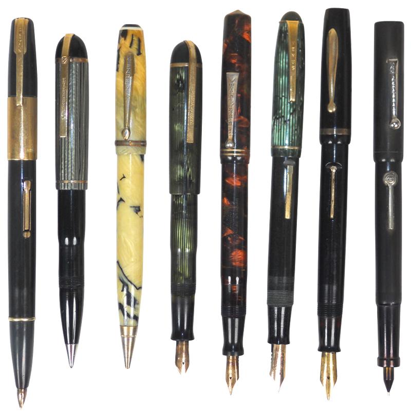 Fountain pens (8), includes 1945 Waterman Citation Taperite pen-Black w/Gold filled trim & tip, Wasp Clipper-Black w/Gold filled trim & tip, Venus-Black w/Green striped cap & Gold filled tip, Inkograph-Black w/eyedropper tip, Wahl Oxford-Brown Pearl w/Gold filled tip, 1941 Eversharp Skyline-Green w/Gold filled tip, Eversharp Skyline roller-ball pen & Wearever combination pen & mechanical pencil-Gold/Black, all in VG/Exc cond.