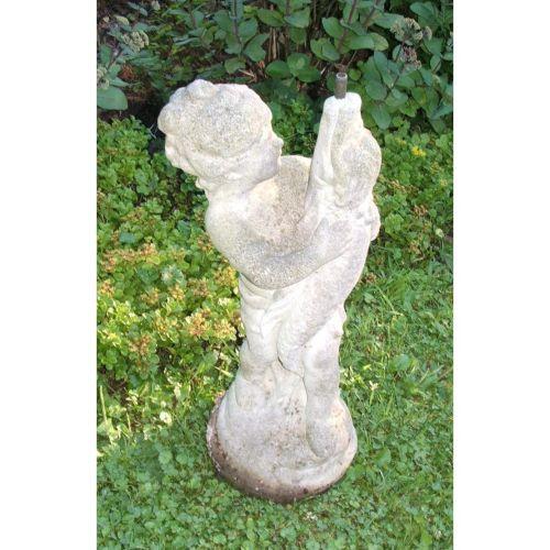 Cast stone. Garden fountain of a young cherub holding a stylized dolphin with a brass spigot in its mouth. 23" high