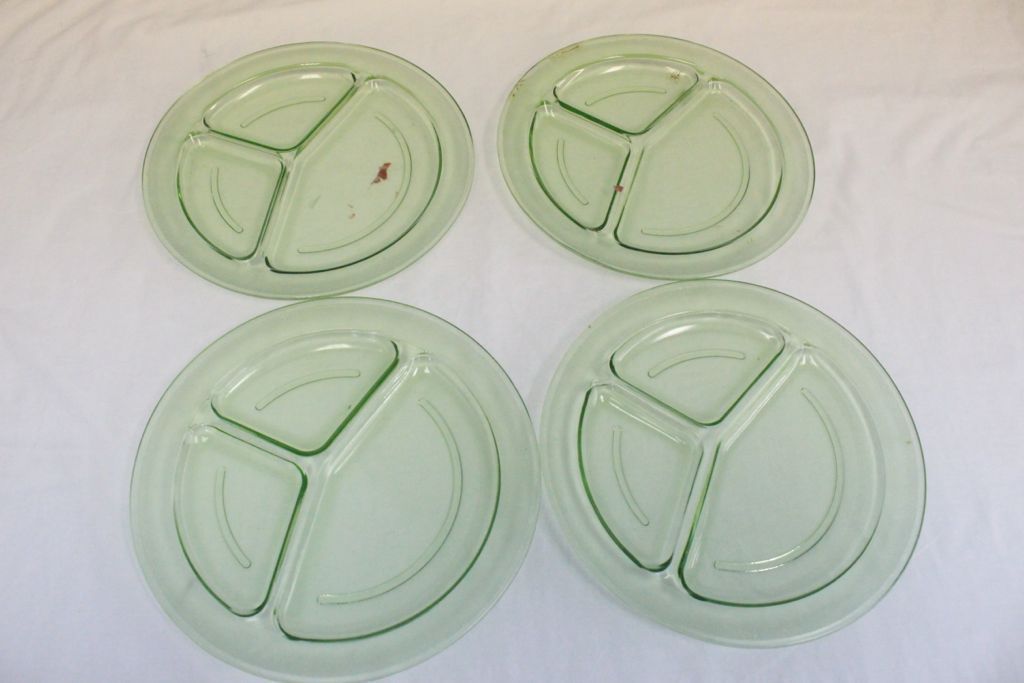 Four 11" Green Depression Glass Divided Plates
