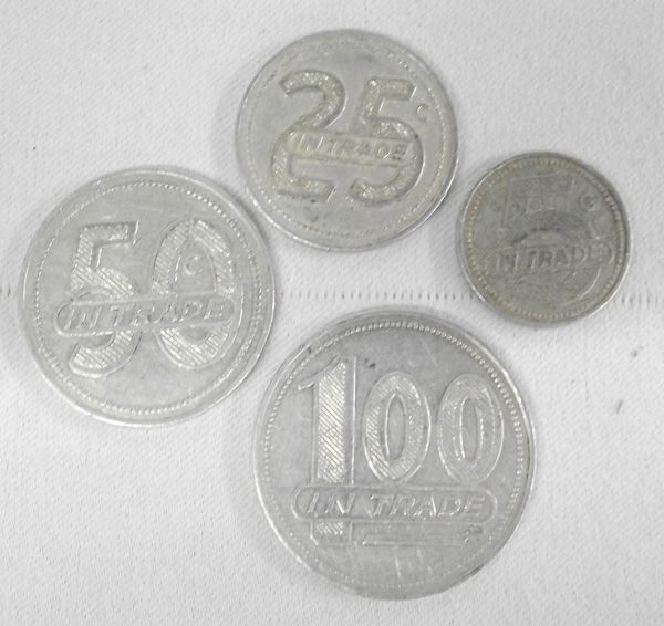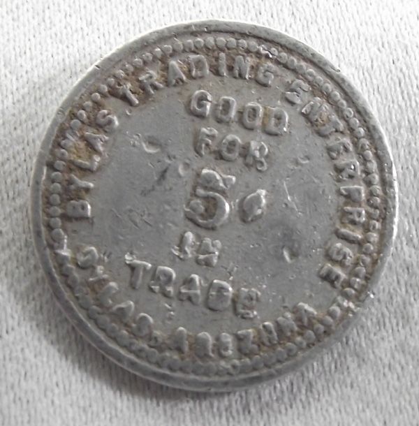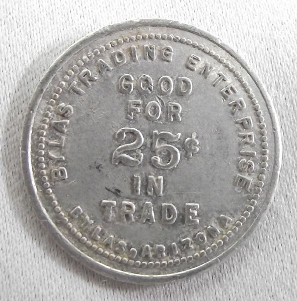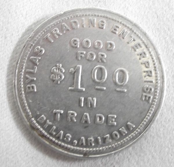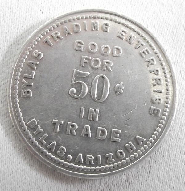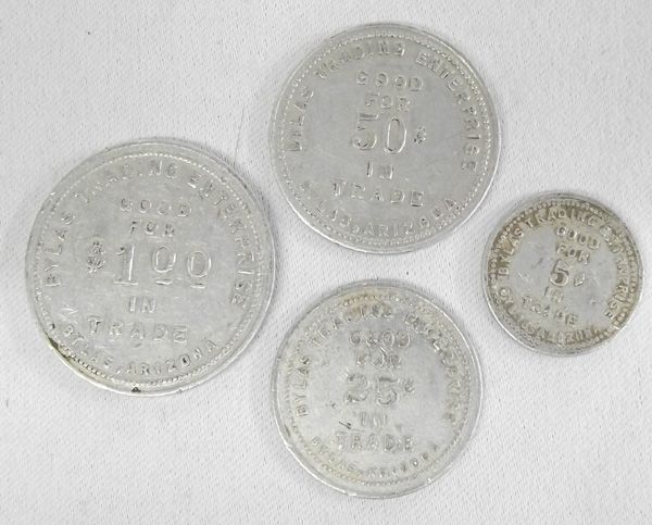 Four 1900 Bylas Arizona Trading Post Trade Tokens, to include 1.00 token, 50 cents, 25 cents and 10 cent tokens.