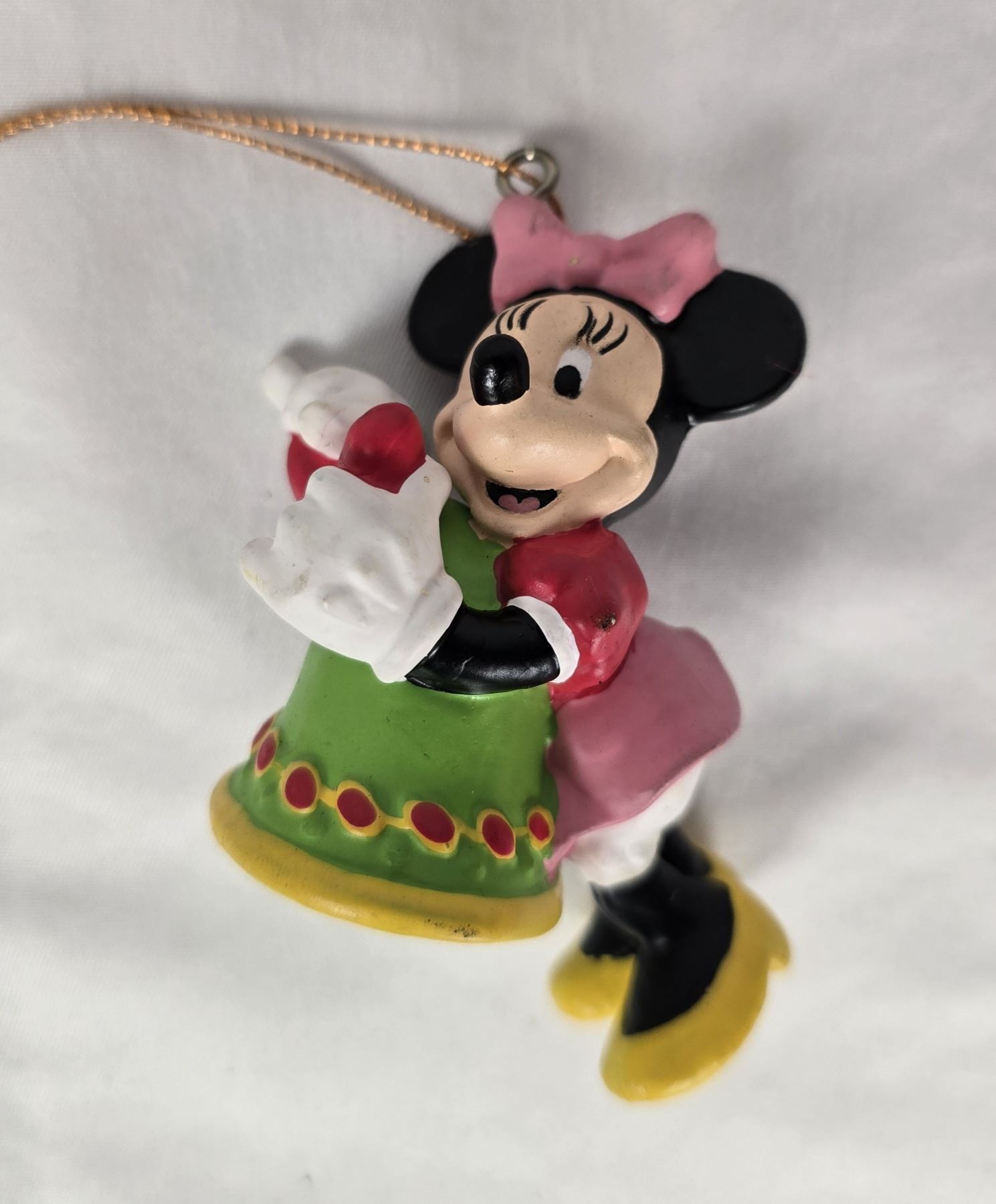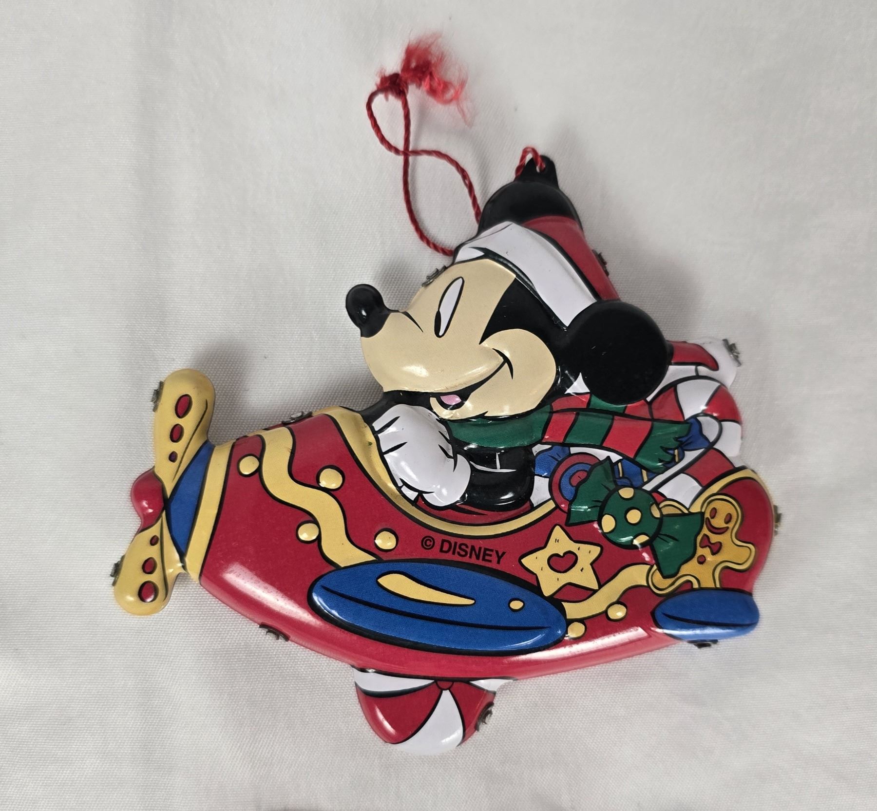 This is a set of 4 ornaments featuring Disney characters. One is tin and the other three are PVC. The tin ornament is Mickey delivering presents in a Christmas airplane. The three PVC ornaments feature Goofy hanging a wreath, Mickey painting a candy cane and Minnie decorating a bell. Total shipped measurement is 6" x 5" x 3" and weighs 6 oz.