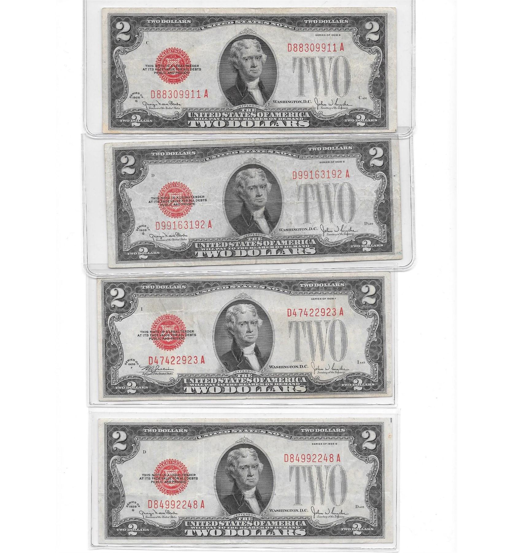 Four (4ct.) Nice 1928 $2.00 Notes. Nice XF-AU Notes