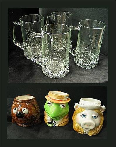 Four 6 1/2" tall mugs with a wheel cut golfing design and three authorized Jim Henson Muppet Shop mugs standing 4 1/2" tall. No chips or cracks