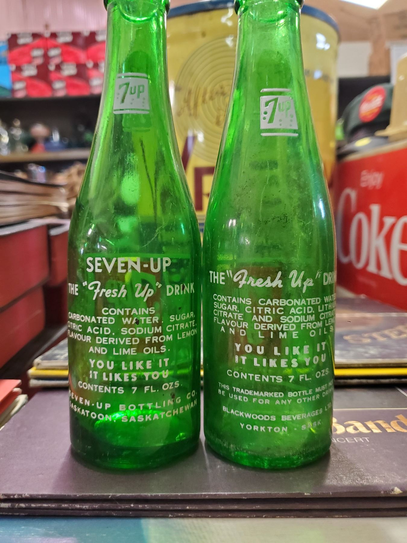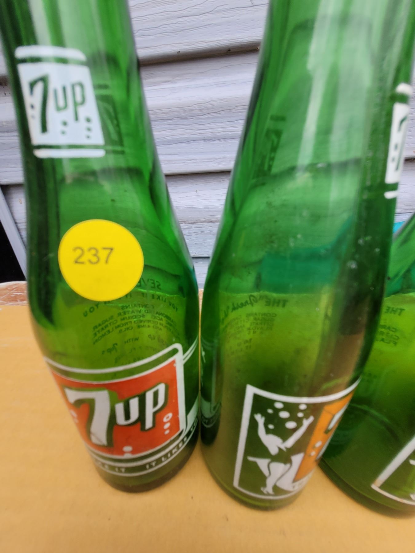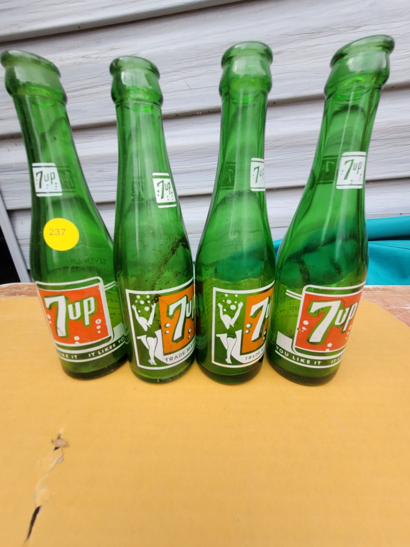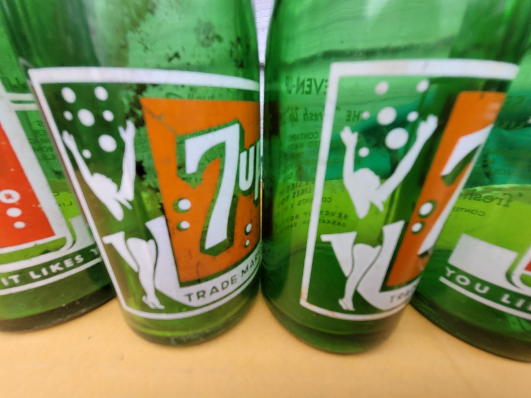 Four 7 oz 7-UP bottles, two with bathing suit girl