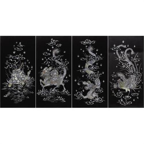 <B>Four Asian Lacquer Panels<BR></B></I>Unknown maker, possibly Vietnam<BR>Twentieth Century<BR>The four panels of mythical animals in mother-of-pearl on black lacquer<BR>Unmarked<BR>47.2 inches high x 23.7 inches wide<BR><BR><b>Shipping:</b> Requires 3rd Party Shipping (<a target="_blank" href="http://www.heritageauctions.com/common/shipping.php">view shipping information</a>)